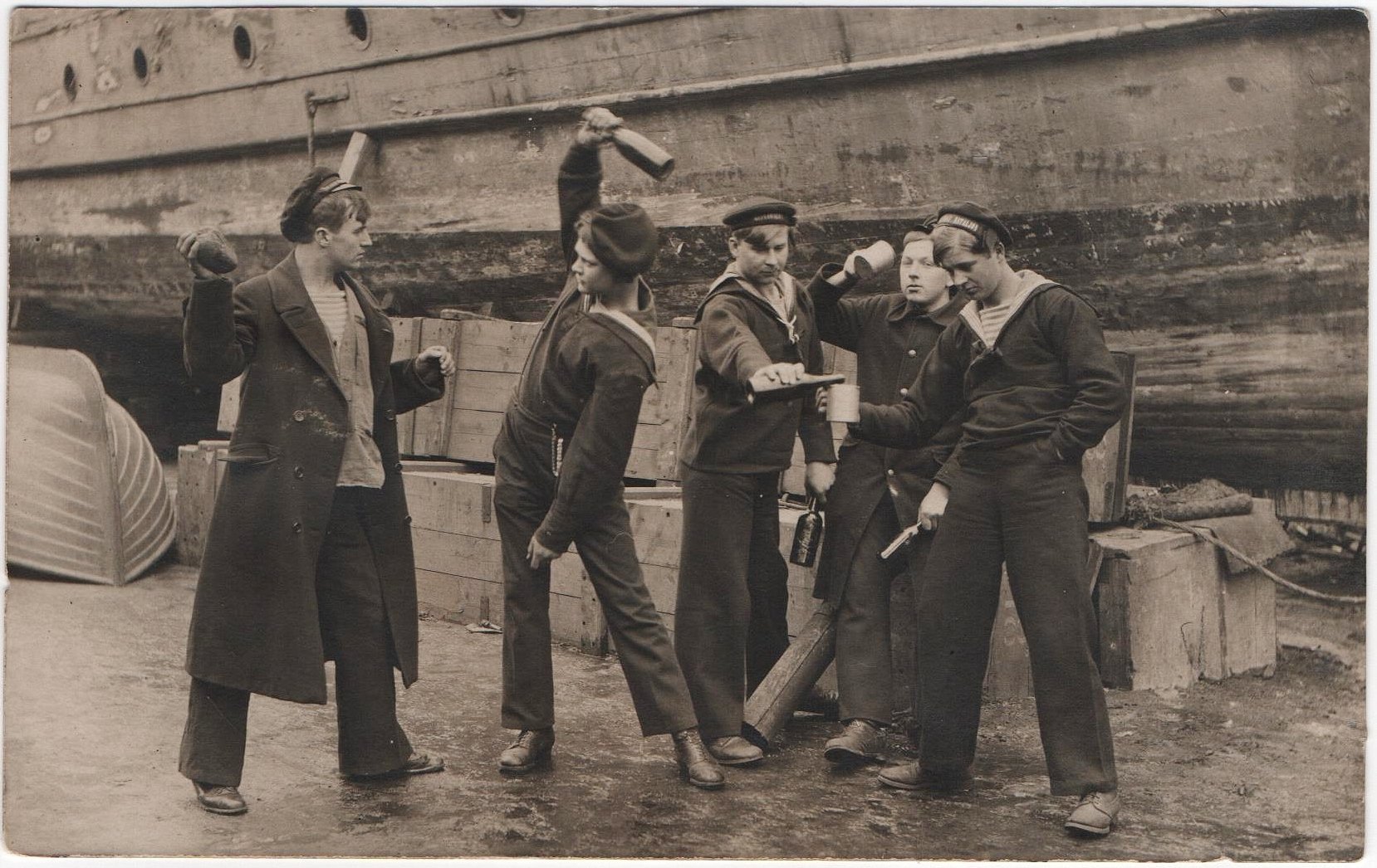 Eesti Mereväe õppekomando (Mereväe Ekipaaži õpperühm) 1919.a. Algselt asuti Tallinna sadama tollimajas, fotod sellest ajajärgust. Esimesel fotol (mehed relvadega) info: Merewäe õpe-komando Tallinnas 10-mal Mail 1919 aastal ja meeste nimed - Lamberg, Ilves, Akelman, Järwan, Werliin, Pommer, Treewing,...