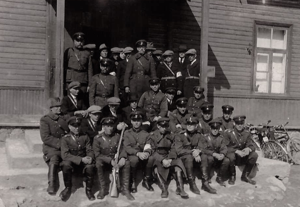 Viru maleva staabi erialapealikud. Vasakult: sanitar pealik. dr. J. Haho, maleva pealiku abi kpt. K. Pajos, maleva pealik kol-ltn G. Vaher, prop.pealik. H. Avikson, käskudetäitja pealik H. Linsi, sidepealik A. Rae, majanduspealik K. Blaubrik ja meriüksuse pealik H. Jõgis.