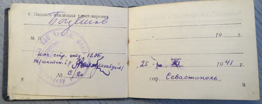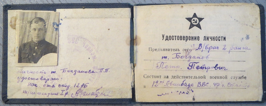 II. järgu sõjaväearst Pjotr Bogdanovi isikutunnistus. Teenis Musta mere laevastiku 12. õhuväebaasis, mis asus Sevastoopolis. 1943. aastal sai majori auastme.