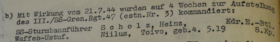 Samal päeval, 21.07 on neljaks nädalaks 47/III juurde komandeeritud Stubaf. Heinz Scholz ja U.Stuf. Toivo Niilus. Sturmbannführer Heinz Scholz kui kõige kõrgema aukraadiga ohvitser võttis üle ilmselt pataljoni juhtimise ja arvatavasti ongi see "keegi sakslane" keda Tammiksaar mainib.