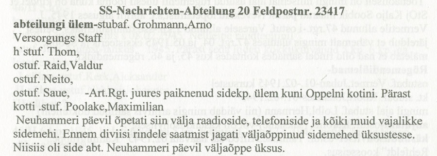 Kaenla all oleva SS veregrupi põletas ära kuuma rauaga (seda ilmselt tehti meie meestest ainult Leegioni meestele? - siit jälle mul idee, et peab 20. Diviisile viitama), seda põletusarmi on sugulased näinud. Kahjuks suri mees enne minu sündimist ja ei saanud midagi küsida, teised jälle ei osanud midagi vastata, alles pole ka migeid materjale, kui oligi siis kartuses hävitati. Alles on küll vanavanaisa foto EW ajast, kus mees seisab ratsaväe vormis ja paar grupipilti. Seega ootan igakülgset abi!
