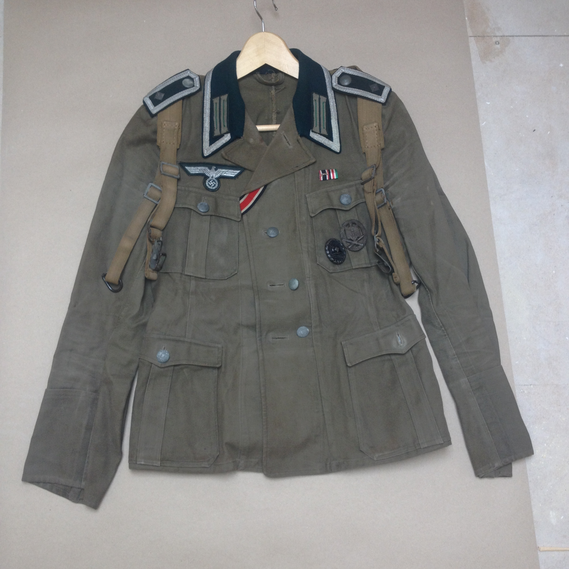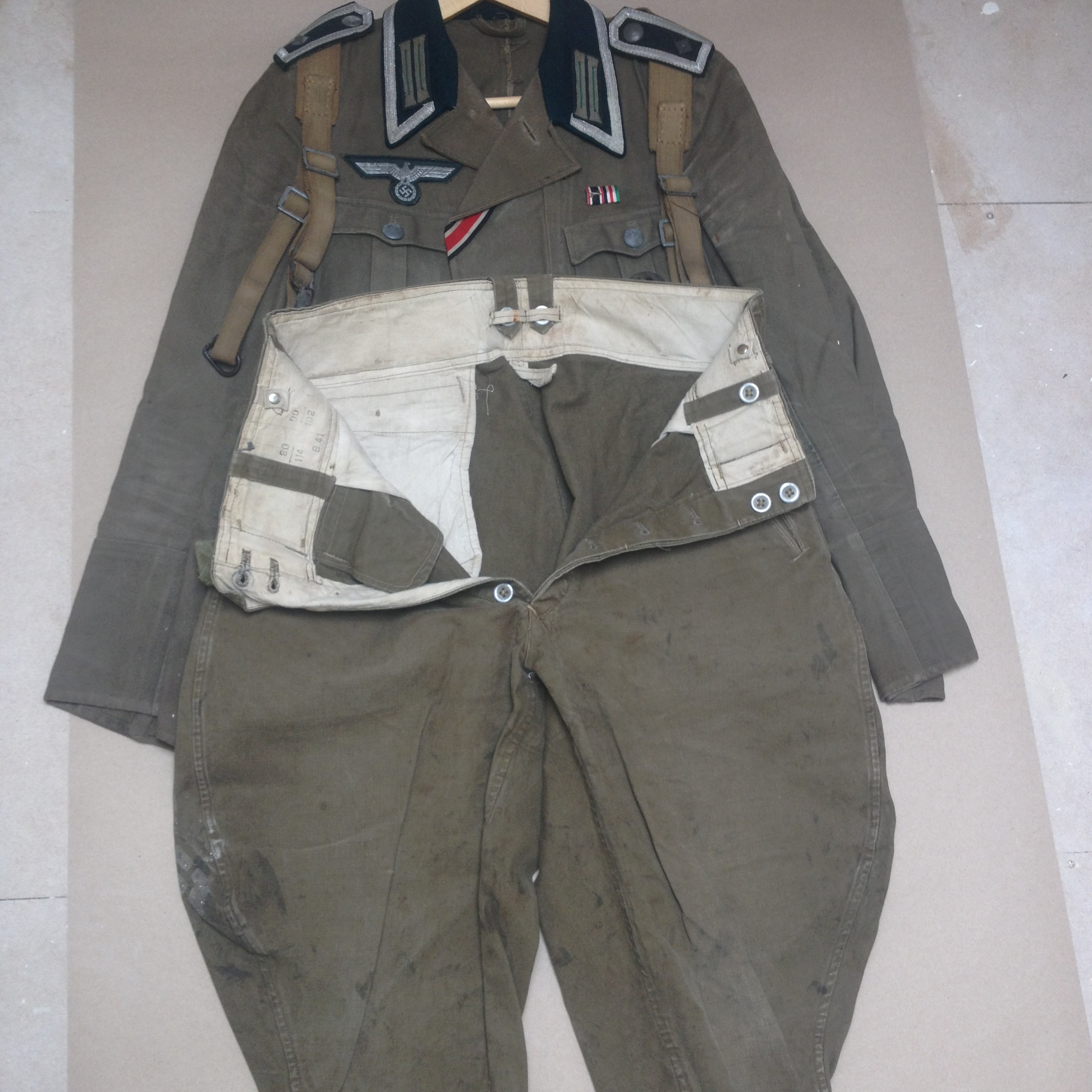100 % Originaal! Komplekti kuuluvad french (kaks nööbikest lahti), püksid, Y- rihmad, üldrünnak ja (kõrge kiivriga) haavatumedal ning pisike lindiliistukene- KVK2 mõõkadega ja Aafrika kampaania medal