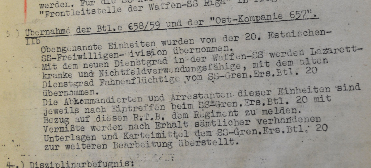Dokument, kus on märge Idapataljonide 658 ja 659 ja Idakompanii 657 üleviimise kohta 20. ED koosseisu - see ED koosseisu tähendab siin Kehra ümbruses asuvat 20. SS Välitäienduspataljoni. Eelpoolnimetatud üksuste haiglaravil viibivad, väejooksikud ja muidu "mittekõlblikud" suunatakse 20. SS Tagavarapataljoni.