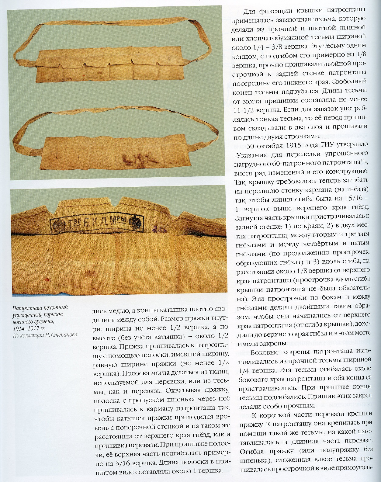 Tsaariväes kasutuselolevad nahaga kanditud taskud (1900. aasta mudel) mahutasid 6 padrunipidet, uus presendist tasku aga 2 korda rohkem. Samuti loobuti naha ja valgevase kasutamisest. Padrunitaskud valmistati immutatud purjeriidest (presendist), pandlad rauast.
