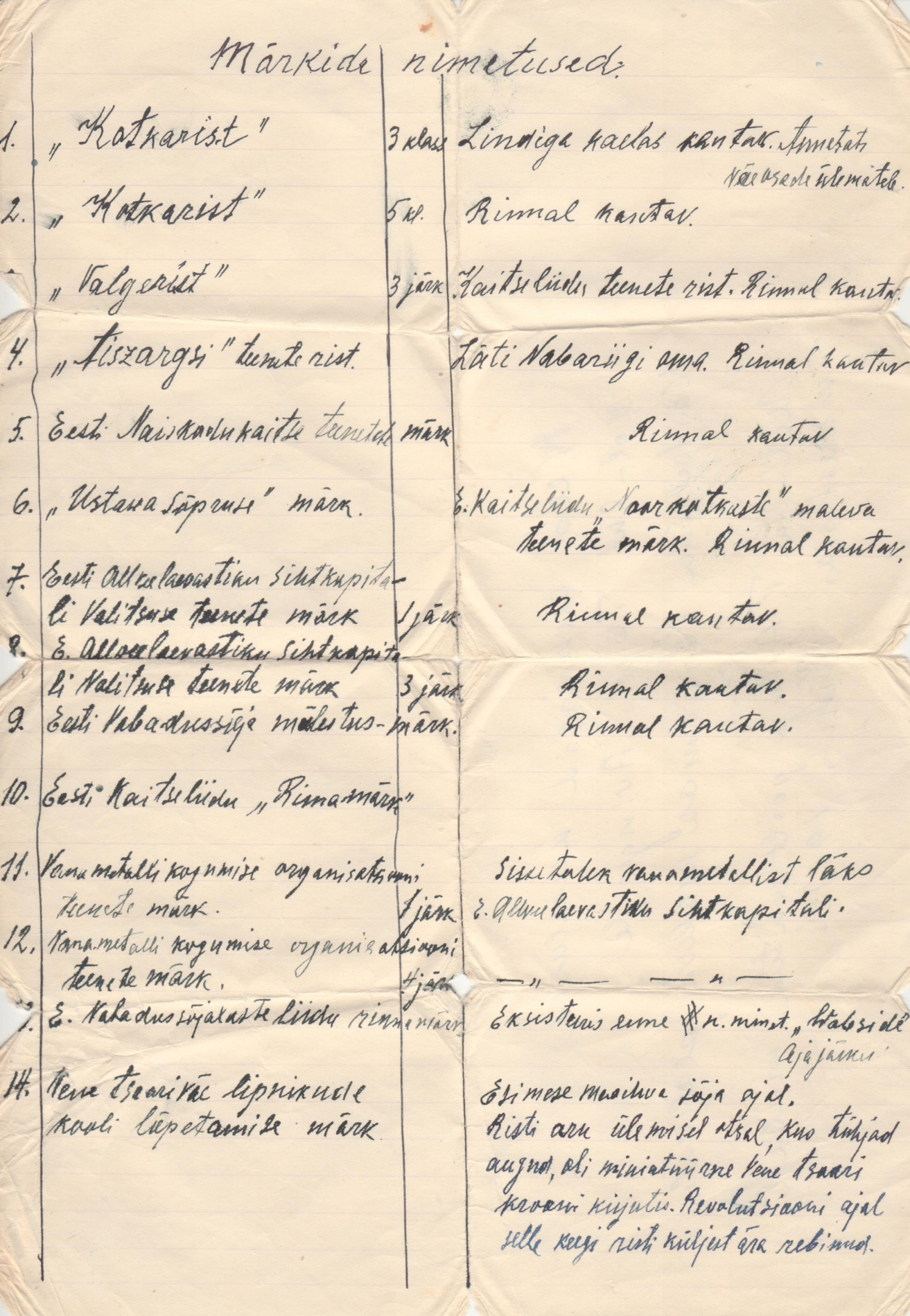 Ja lõpuks eelpool mainitud nimekiri (pastakaga loendi tagaküljele kantud kirjutis on tehtud nn pargimehe poolt):