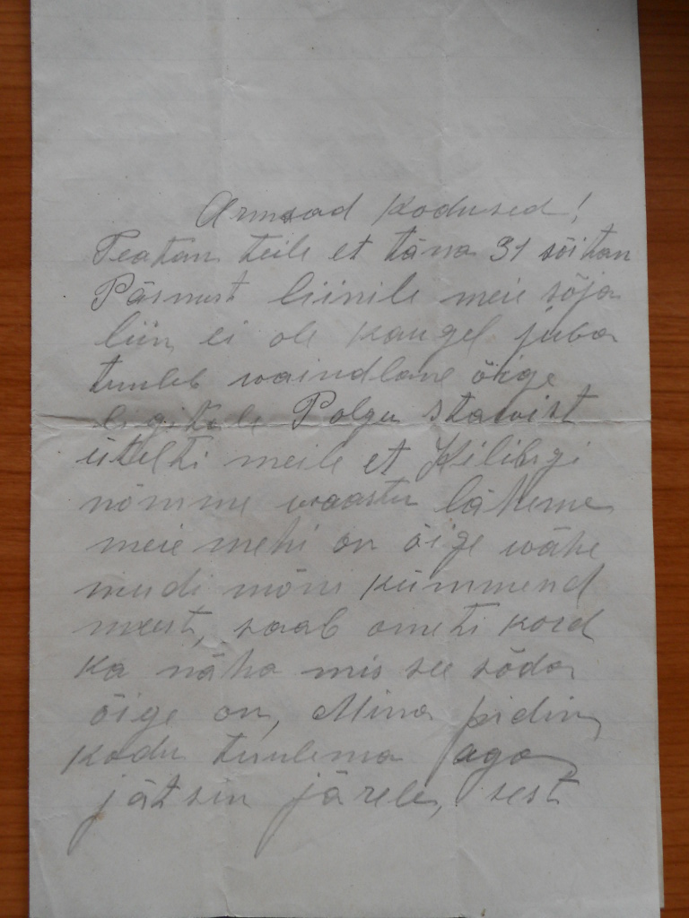 Teatan teile,et täna 31-dal sõidan Pärnust liinile.Meie sõjaliin ei ole kaugel.Juba tuleb vaenlane õige ligidale.Polgu staabist üteldi meile,et Kilingi-Nõmme vastu läheme.Meie mehi on õige vähe,miski mõnikümmend meest,saab ometi kord ka näha mis see sõda õige on.Mina pidin kodu tulema aga jätsin järele,sest meie käest küsiti,kes tahab minna see läheb.Kes ei taha võib koju minna.Seda moodi läks meie roodust kaks jagu mehi koju.?.. walla poisid on ka kõik kodus alles.Pühade järgi meie ?.... Aleksandriga läheme seda ilu vaatama.Muidu linna elu on kaunis vaikne. Muudkui suured ninad kolivad Pärnust ära ja linnamehed jagavad uulitsa peal mõisa maid.Seega pole muud midagi ?....Edaspidi näeb mis saab.Praegu ei tea seda midagi,mis tulevik tooma saab.Peab andma saatuse hooleks,saagu mis saab.