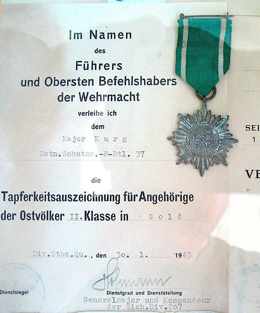 Major Friedrich Kure Kuldse II klassi Ida-ala Rahvaste Vaprusmedali tunnistus ...