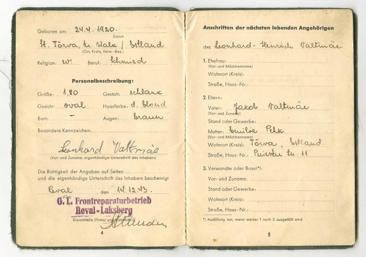 Teema on küll Soldbuch'idest aga postitan siia siiski lisaks ka ühe eestlase Lohnbuch'i, mis on kuulunud kasutaja nublu poolt mainitud organisatsioonis ametis olnud mehele.nublu kirjutas:Algul oli seal sakslaste tsiviilremondiorganisatsioon Frontreparaturbetrieb GL Reval Espenlaub, see kolis siit aga 1943. a. sügisel Riiga. Siis avati samades ruumides puht sõjaväe ettevõtmine Werftabteilung 101/I (kus I seal lõpus näitab jällegi Luftflotte I allumist), mille ülemaks sai senini Ülemistel lennukite remondiga tegelenud Herbert Joari. Ilmselt kolis sinna Werftabteilungisse üle enamus Espenlaubi kohalikke töötajaid ning nagu näha - mõned mehed ka Ülemistelt.