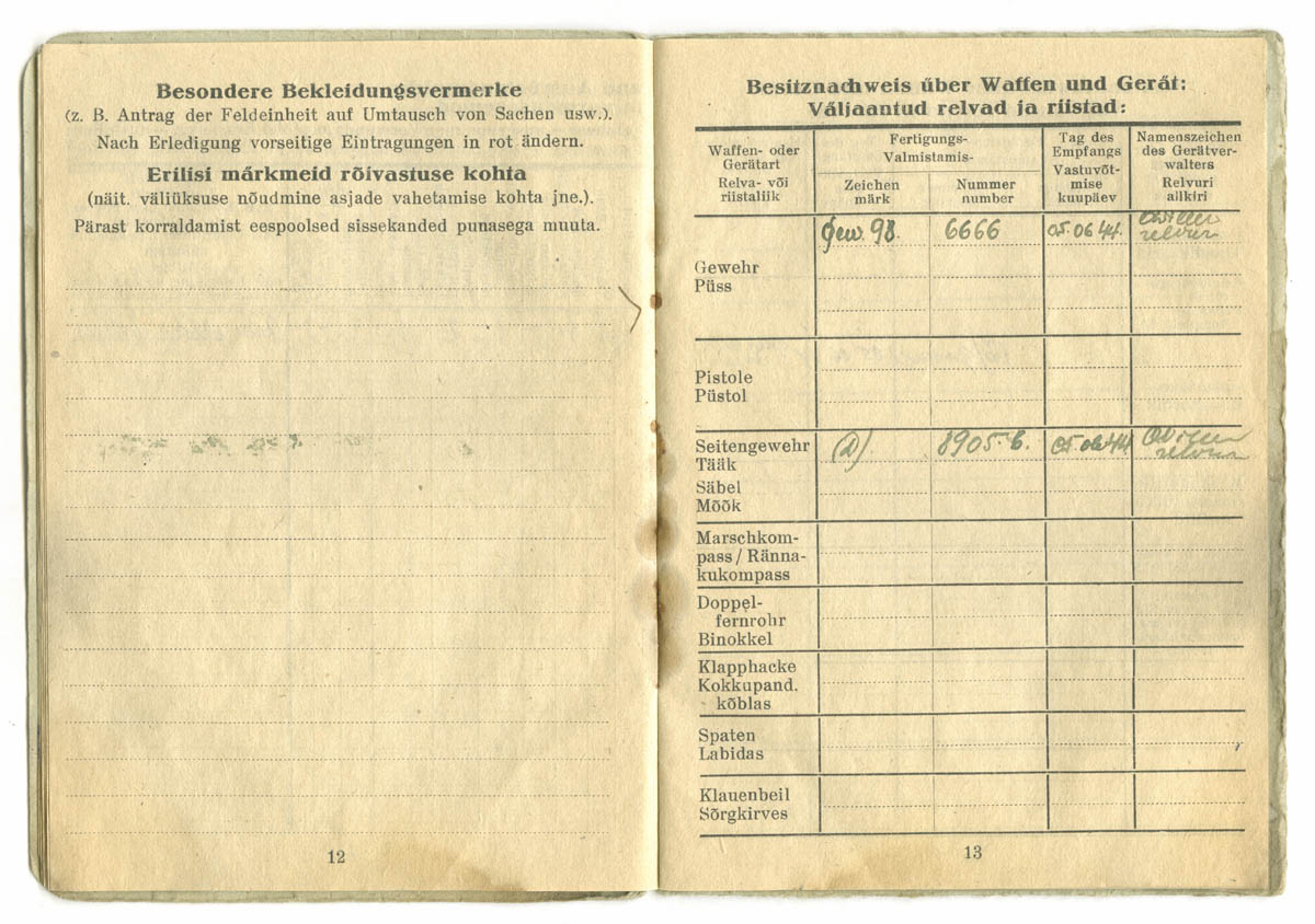 See palgaraamat on välja kirjutatud SS-Ersatzkommando Estland Pärnu Kaitseväeringkonna teenistuses olnud reamehele Juhan Suura'le. Soldbuch'i huvitavamad detailid on mõned ilusad templid ja paar allkirja, mille autor peaks olema Sturmbannführer Ain Mere.