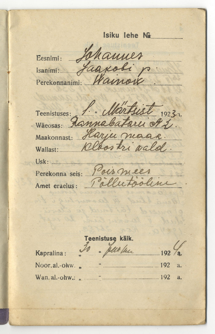 Aegnasaare Komandantuuris teeninud reamees Johannes Vainovi sõduriraamat 1920-ndate aastate I poolest.