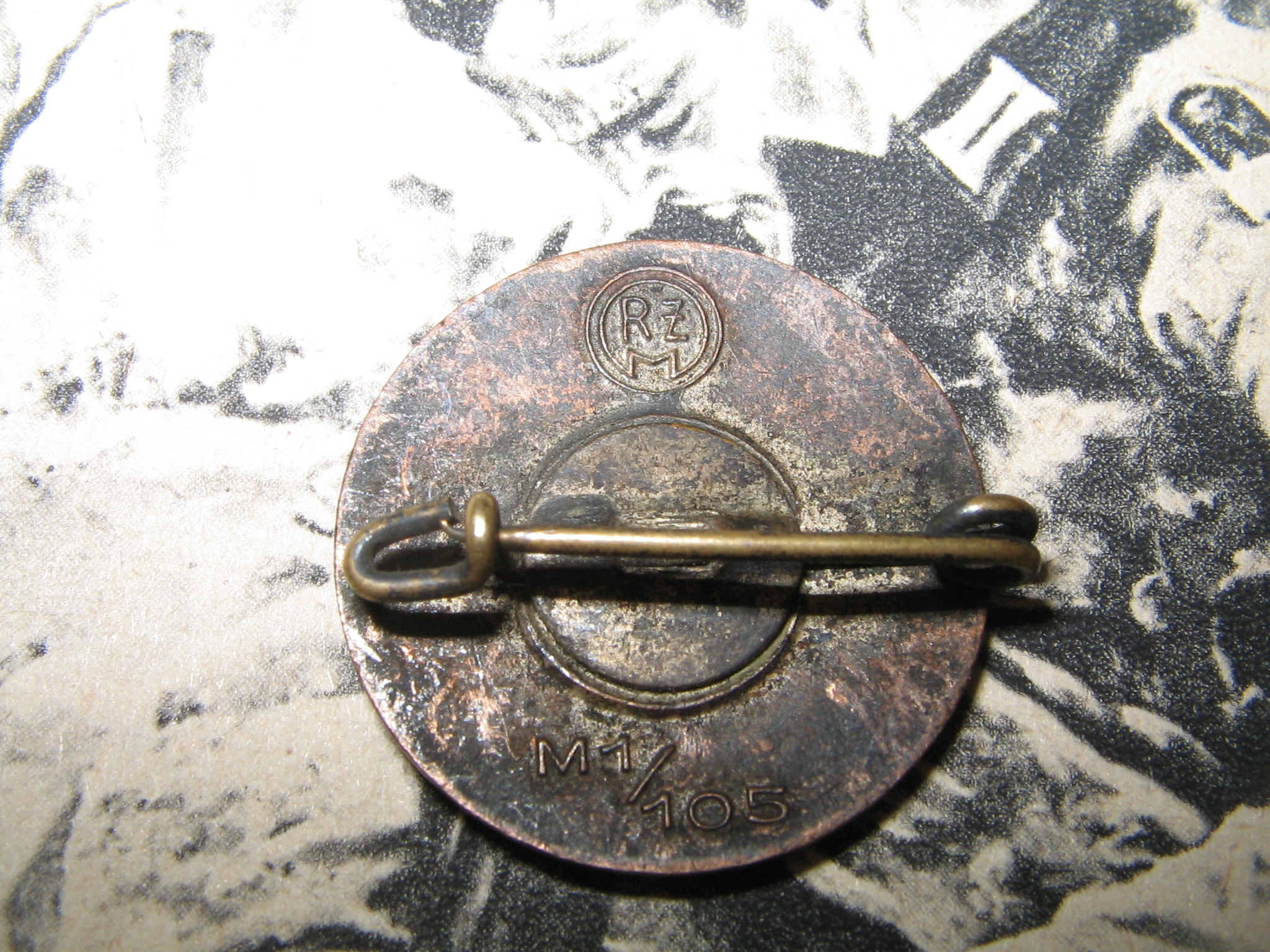 Märk on varasest RZM-perioodist. See on juba mitmes selline märk, millel on nõel deformeerunud ja lapikuks vajutatud. Mulle tundub, et selline deformatsioon on neil märkidel tehtud meelega, et oleks mugavam märki kanda. Samal eesmärgil on arvatavasti eemaldatud ka nõela tipp minu poolt varem postitatud GES.GESCH markeeringuga märgil. Kas keegi on midagi sellist ka enda märkide puhul täheldanud?