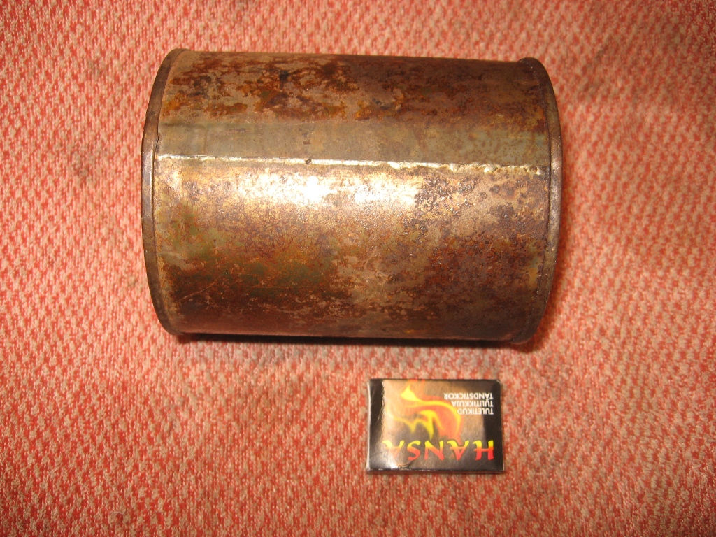 Mea Culpa! Muidugi oleks pidanud kaasaegse kõrvale panema. Üldiselt on väga sama mõõtu. Kõrgus 54 mm, läbimõõt valtsi pidi 104 mm, sisekõrgus 46 mm. Põhjal, kaanel lastud kolm ringi sikemasinaga ja plekk veidi toekam.