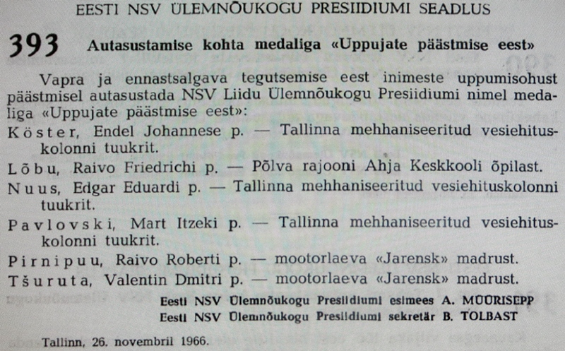 Üks Uppuja päästmise eest veel lisaks. 1966. aastal autasustati medaliga 19 korda.