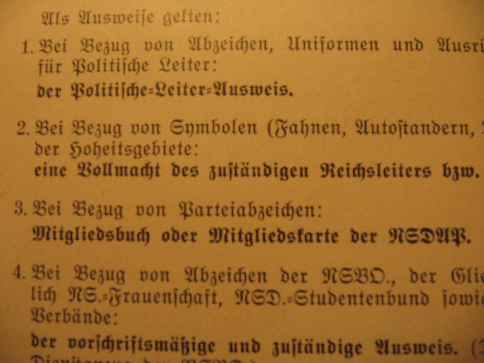 Parteimärke ostes tuleb pöörata tähelepanu ka asja juriidilisele poolele - tegelikult ei tohiks parteimärki müüa kellelegi, kel pole ette näidata NSDAP parteipiletit või liikmekaarti! Vähemalt väidab nii "Organisationsbuch der NSDAP", välja antud Münchenis 1936.a. Seni pole mul ühegi ostu puhul veel dokumenti küsitud...