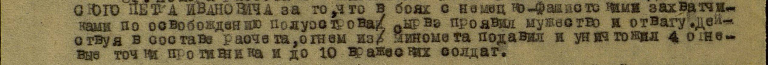 Sooritas eduka manöövri küljelt ja vaenlase tagalasse, paiskas laiali vaenlase tugipunkti ja sundis ta lahkuma, millega kindlustas edu kogu diviisile.
