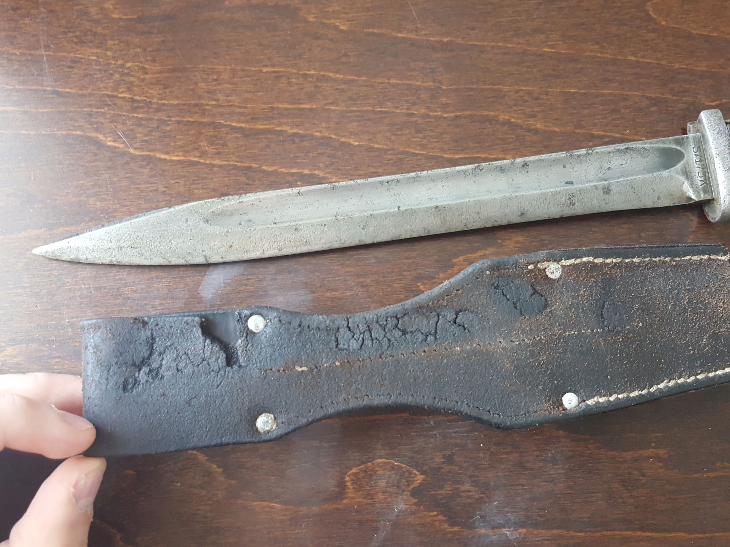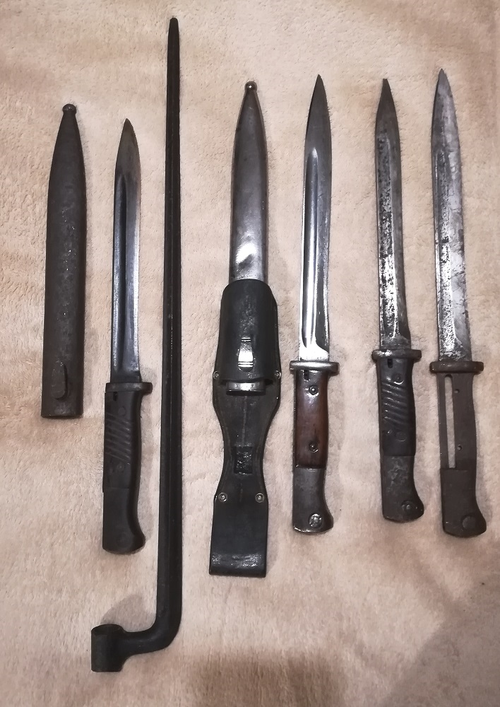 Vasakult alates: 1) Teritatud, nupu pea ning pealmine sälk maha käiatud, tupe roostes, bakeliidid ilusad 2) Muidu oleks ilus berdan, aga kinnitus on haihtunud 3) nahal puudu kinnitusrihm, tupe läikivaks hõõrutud nagu ka tera, põsed puust ja tunduvad originaalid, teritatud, numbrid klapivad 4) Teritatud, ilmselt vett ja külma saanud, bakeliit on kõveraks paisunud 5) rõvedalt teritatud, nupp kinni