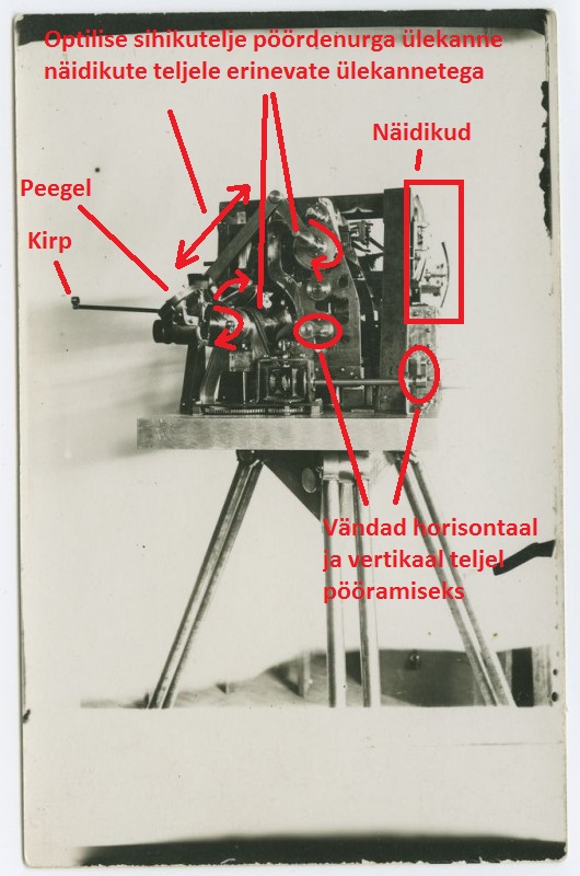 On peatelg, mille küljes optika, mida pööratakse väntadega > selle pöörded kantakse eri koefitsentidega üle osutite teljele. Vahepeal on veel palju mudru.