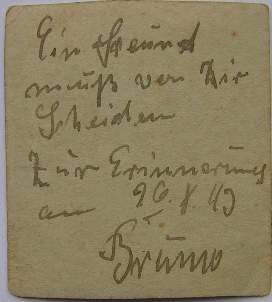 Ma loen sellelt kaardilt välja: ''Ein Freund muss vor Wir Scheiden zur Erinnerung an. Bruno'' mis võiks kõlada umbes: ''Sõpra peab enne lahkuminekut meeles pidama. Bruno'' - eks teadjamad parandavad.
