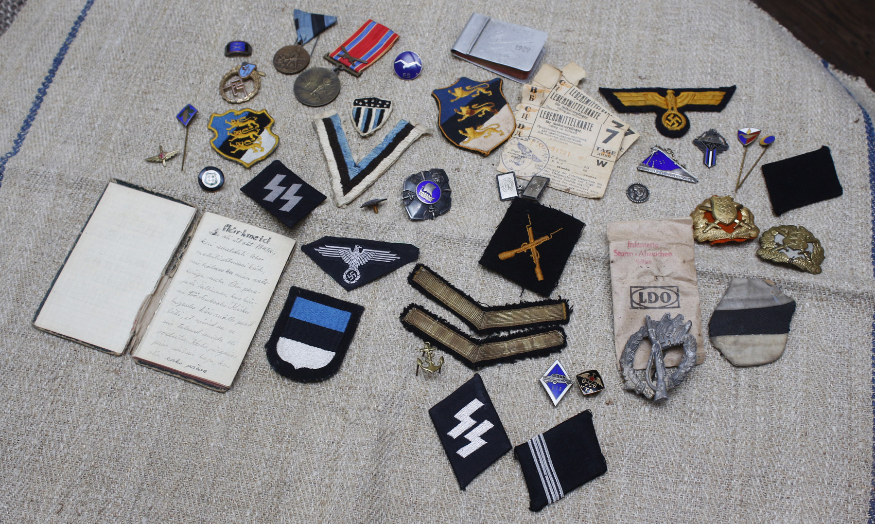 Kaitseliidu Saaremaa maleva rinnamärk kuulus Pöidest pärit Aleksei Truumets'ale (Truuvert), kelle elu lõppes 1948. aastal Venemaal vangilaagris. Vasakul olev märkmik, välkudega kraenurk, kotkas ja Dachau kilp olid Sturmgeschütz Abteilung 20 ridades teeninud Grenadier Ülo Käbin'i omad. Pildi keskel olev lõvidega kilp, märkmik, mansetinööbid ja vangilaagri toitlustuskaardid kuulusid Elmar Kanep'ile. Mees mobiliseeriti Punaarmeesse ja oli Tšerbakulis kui formeeriti Eesti laskurdiviise (sellest ajast on ka märkmik). Ilmselt Velikije Luki all jooksis üle, istus natuke aega vangilaagris ja teenis hiljem ühe Politseipataljoni ridades. Vabadussõja aegne Kalevlaste Maleva embleem, Vabadussõja mälestusmedal & 10. aastat Läti VS'ist kuulusid Karl Müller'ile. Päris Vabadussõja lõpus ülendati ta vanemallohvitserist ohvitseri asetäitjaks. Vasakus servas olev kolme lõviga kilp oli Valter Kivioja oma. EW mereväe auastmetunnused ja riviala eraldusmärk kuulusid Oskar Ferdinand Allik'ule, kelle teenistusaeg jäi 1930-ndate keskele. Paberkotiga jalaväerünnak, käisekilp ja kaks EW mütsimärki kuulusid hilisemale Hauptstufmührer Theodor Liht'ile. Käisekilp on eeldatavalt ajast kui ta teenis Rebase pataljonis kompaniiülemana.