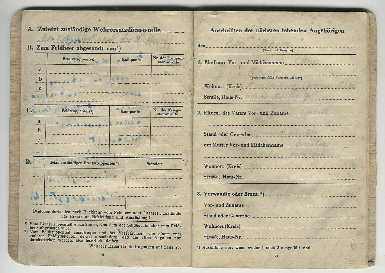 Nooremleitnant Evo Meere soldbuch. Langes 1945. a mais Neuhammeris. Soldbuch kuskil välismaa kogus.