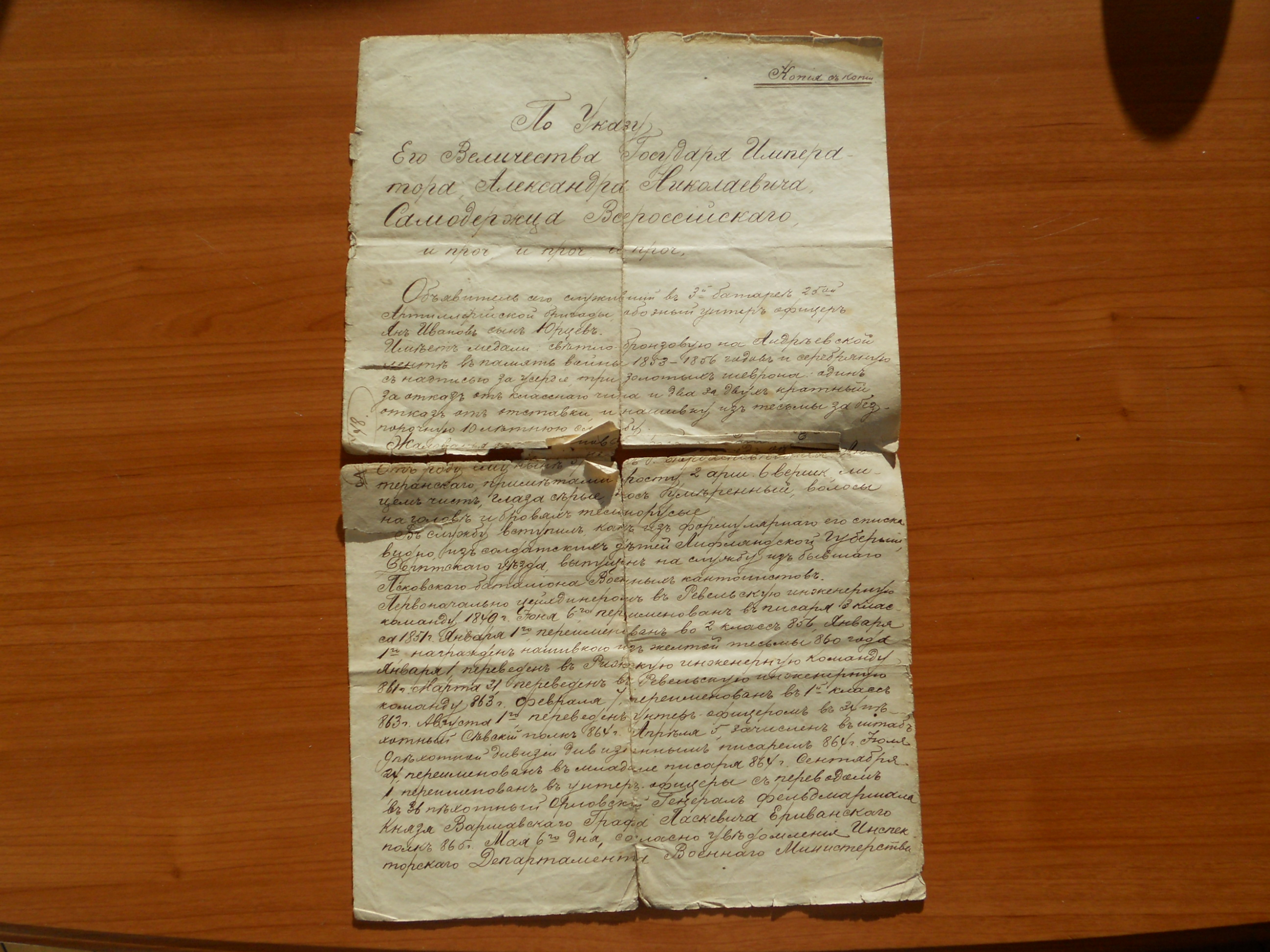 Объявитель сего служивший в 3-й батарее 25-й артиллерийской бригады, обозный унтер-офицер Ян Иванов сын Юрцев.