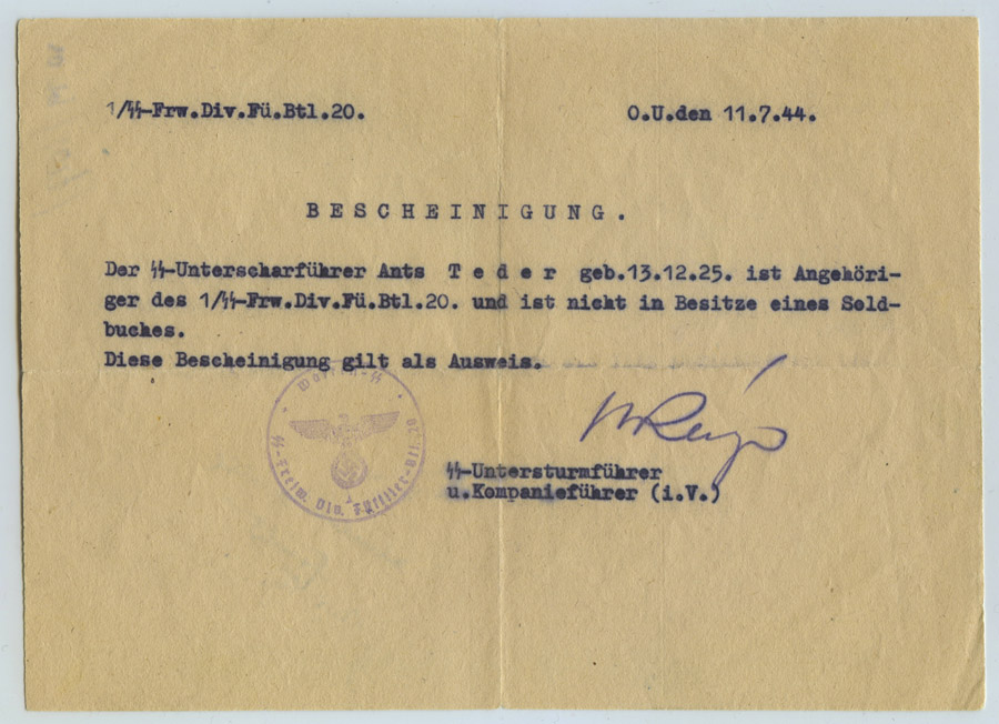 11.07.1944 sai Uscha. Ants Teder tunnistuse, kus on kirjas et ta kuulub 20. füsiljeepataljoni 1. kompanii koosseisu ja ta ei oma Soldbuch'i ning see käesolev tunnistus kehtib isikutunnistusena.