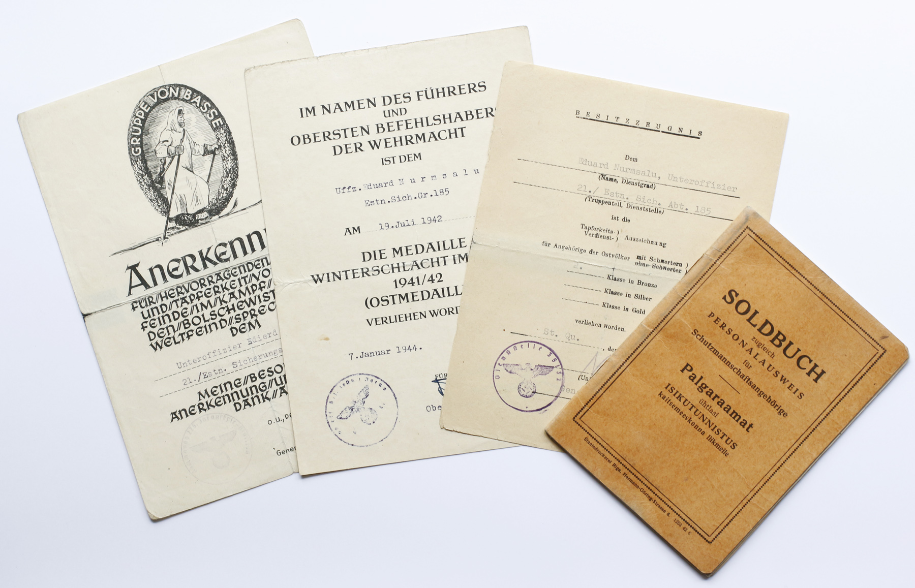 286. Eesti Politseipataljoni Wachtmeister Eduard Nurmsalu astus juba 1941. aastal vabatahtlikult Saksa sõjaväkke ja võttis osa lahingutest 185. Eesti julgestusgrupi 21. sadakonna ridades. Autasustati von Basse tänukirja, Talvelahingud Idas medali ja Ida-ala Rahvaste Vaprusmedaliga - võimalik, et hiljem lisandus veel midagi aga tunnistused on olemas nende kolme kohta. Kummalisel kombel ei ole ühtegi autasustamist tema palgaraamatusse sisse kantud.