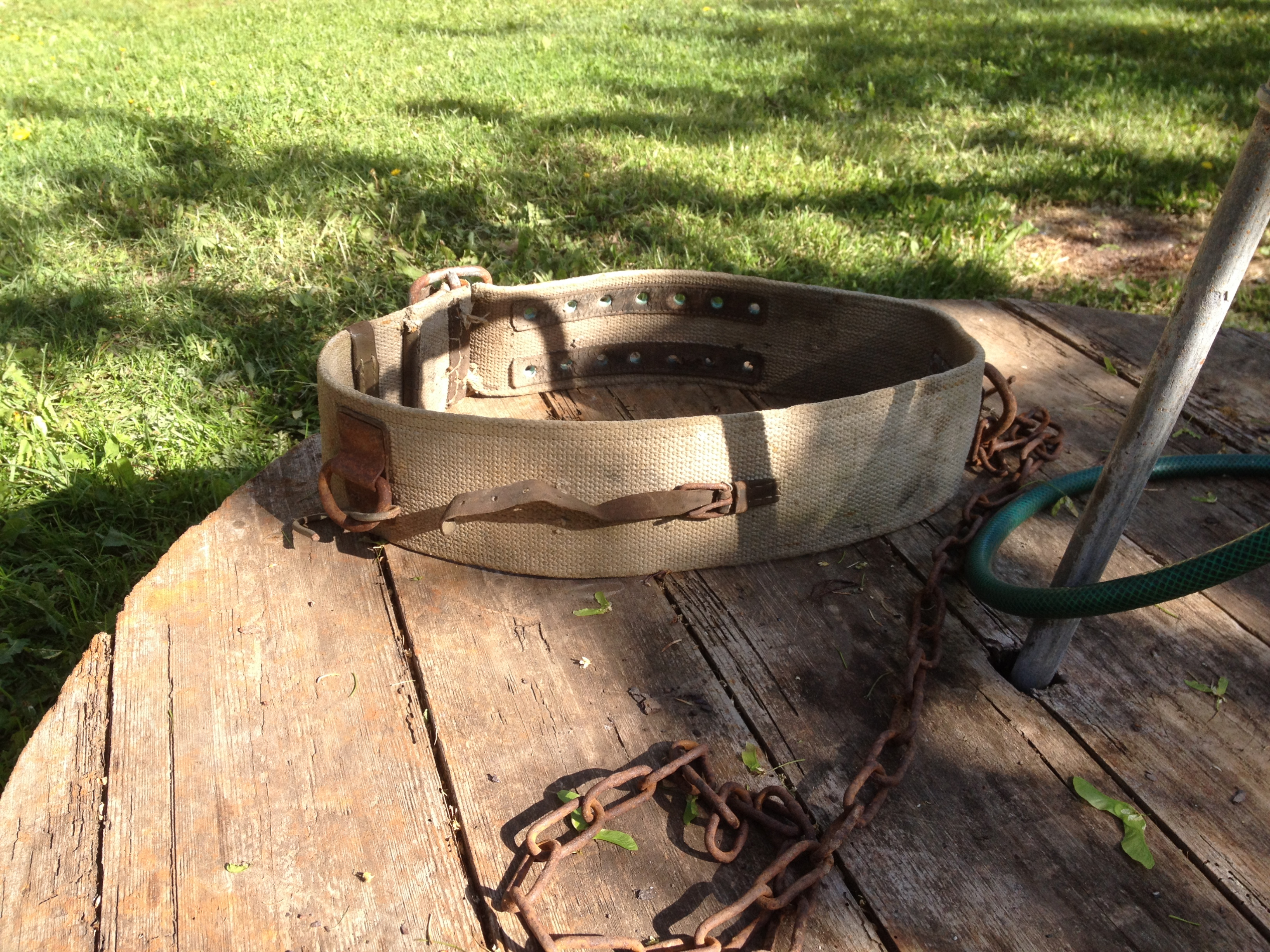 Tapiku koti piirkonnast tuli selline vöö , ilmselt peaks olema posti otsa ronimis raudadega komplektis, mingeid markeeringuid ei leidnud, ühelt aasa kinnituselt tunduks nagu vene rohelist kumavat. Siit küsimus mis ajast ja kas võib olla mingit seost militaariaga või tavaline telefonimontööri vöö ?