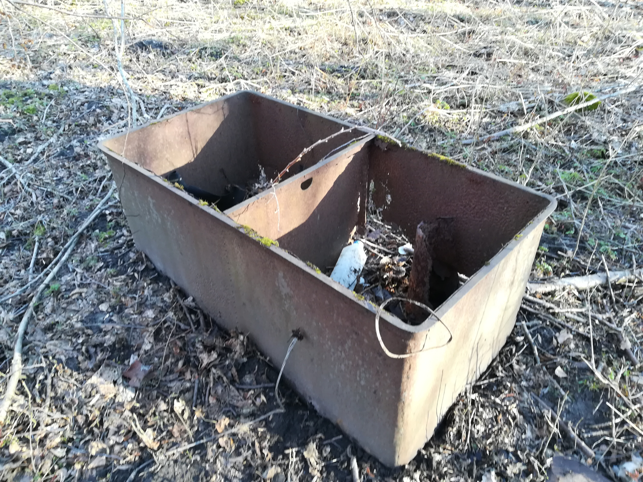 Ühes talu prügihunnikus vedeles koos muu saksa nassvärgiga selline needitud anum. Tegumood on jube saksalik, aga kuhu ta sobida võiks, ei tule ette. Külje pikkus on vast kuskil poolteist meetrit. Läheduses vedeles paar ca 20cm diameetriga rauast mürsukesta ja stereokaugusmõõtja vidinaid. Ehk tuleb kellelegi ette, kuhu see passiks?