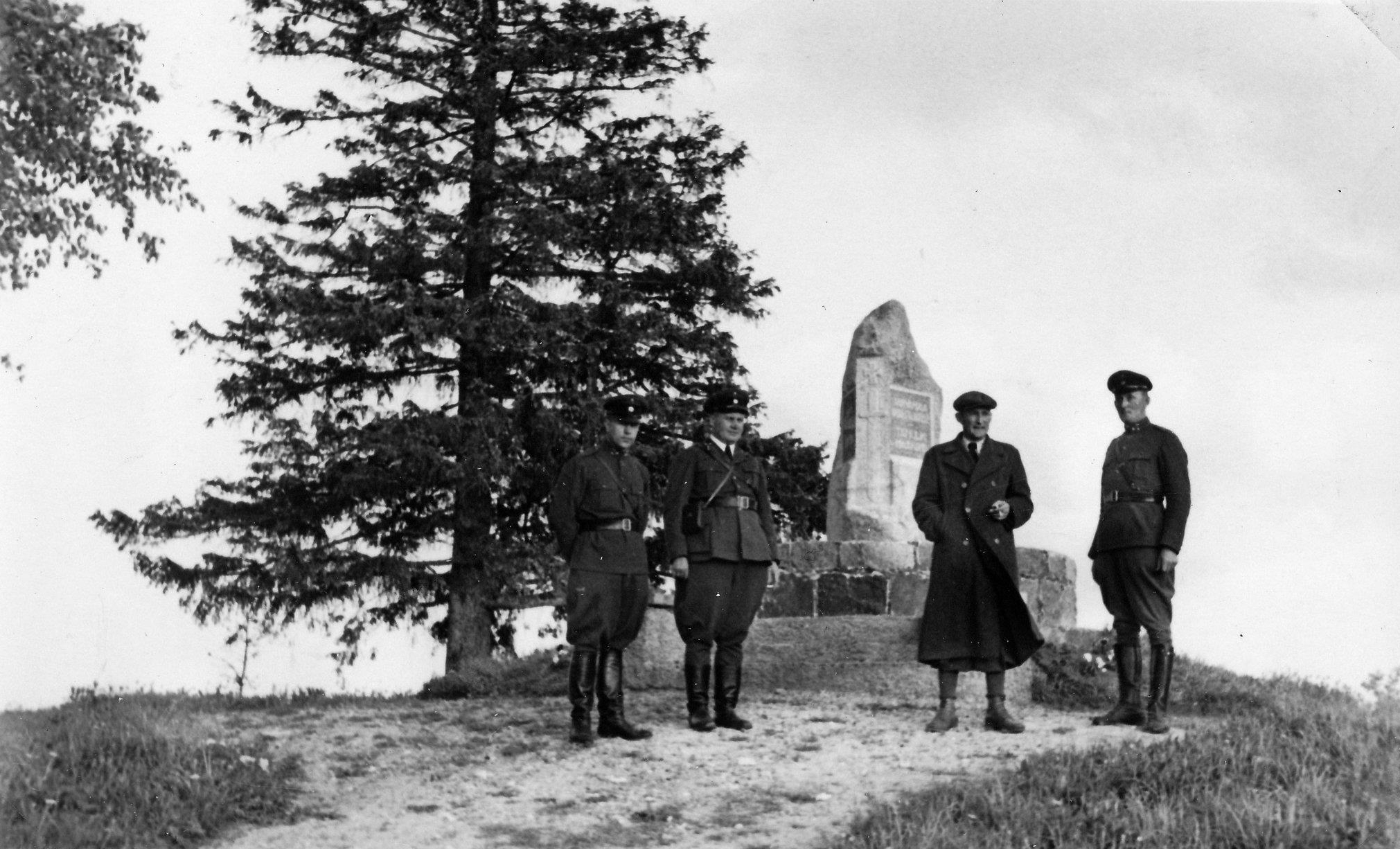 Metsainspektorid (vasakult) Arnold Buldas, Ernits, E. Kohh ja Aleksander Raukas Vabadussõja Müüsleri lahingu mälestusmonumendi juures 1937. aastal ...