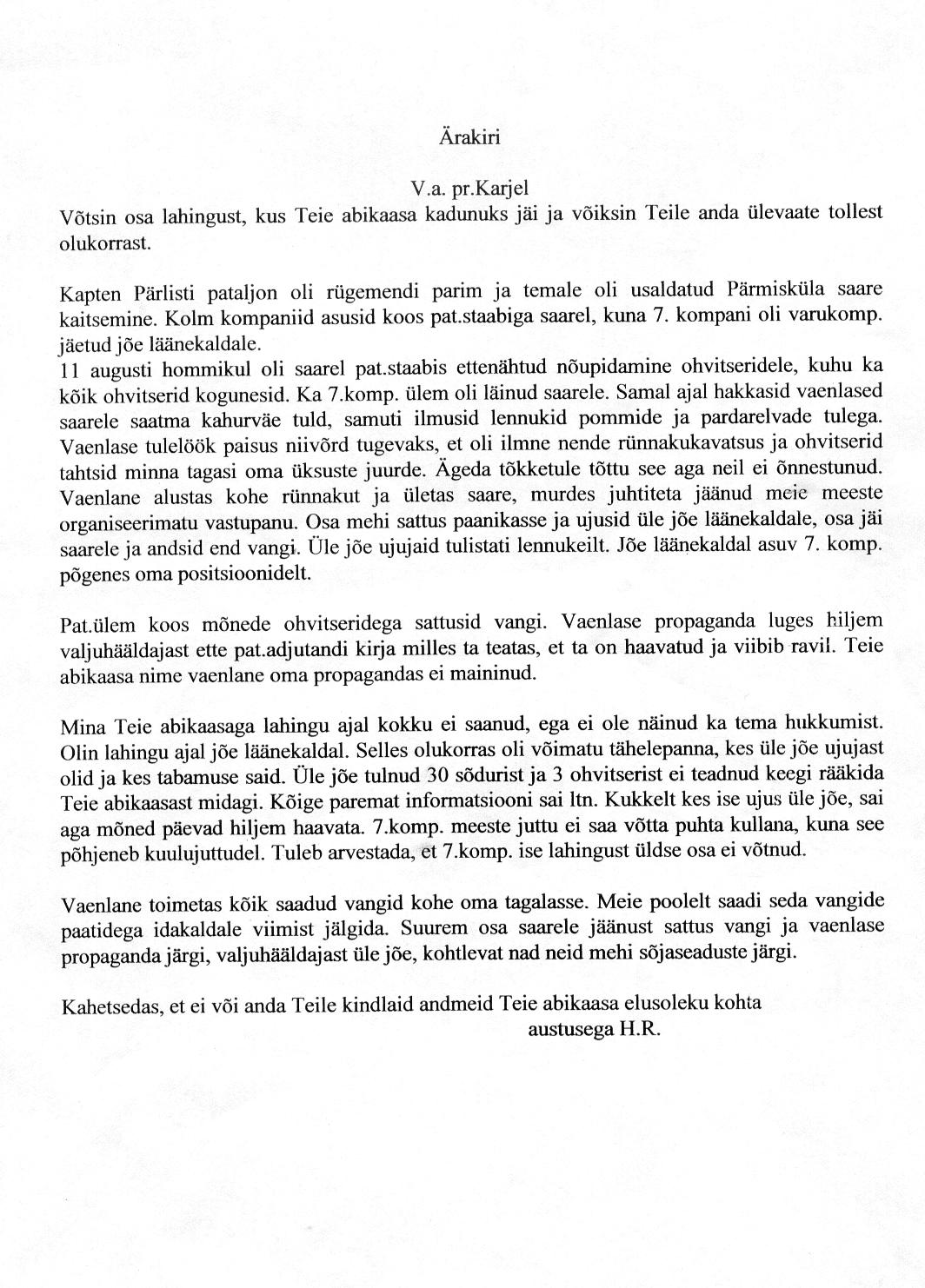 Saarel oli 2. pataljonist 5,8 ja 6. kompanii.Seitsmes kompanii oli Permisküla juures Narva jõe kaldal. Kuigi 7. kompanii ülem Juko Karjel ise viibis 11.Augusti hommikul saarel,staabis nõupidamisel.Olen osalenud kolmel ekspeditsioonil Permisküla saarele.Oleme tuvastanud pataljoni staabi koha ja pioneeride poolt tehtud puust silla koha.Lisaks ära toonud saarelt 6 mehe säilmed kellest üks on kuulunud sinna side luure neljast mehest kuulunud gruppi.Karjeli tütar on veel elus ja elab Rootsis.Lisan ärakirja Karjeli lesele toodud kirjast mille on kirjutanud lahingust osavõtnud inimene kes küll kahjuks tundmatuks jääb.