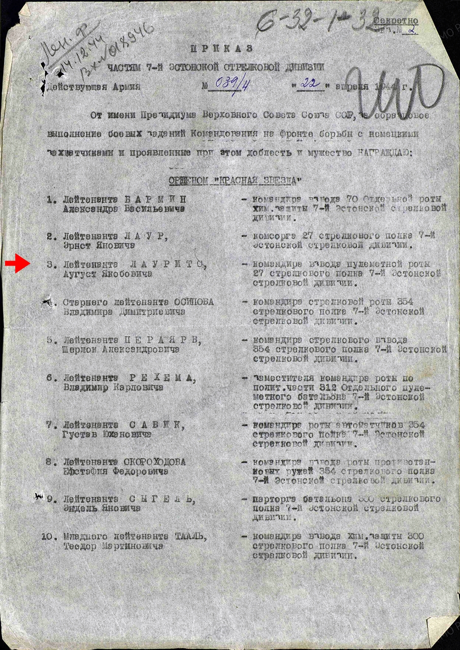 Pildild näha oleval käskkirjal on meeste nimed tähestikust tulenevalt samas järjekorras nagu neile antud ordeni numbridki, Laur ees ja Laurits järel. Sellise loogika kohaselt võiks ju oletada, et käskkirjaga välja antud 12-ne Punatähe numbrid olid 516 405- 516 416 ja nimed-numbrid jooksevad vastavalt… aga see ei pruugi muidugi sugugi nii olla.