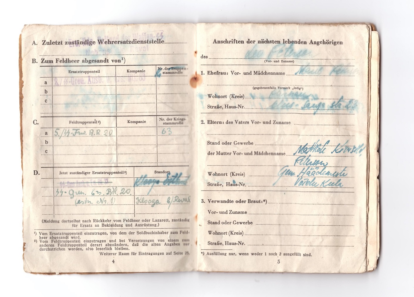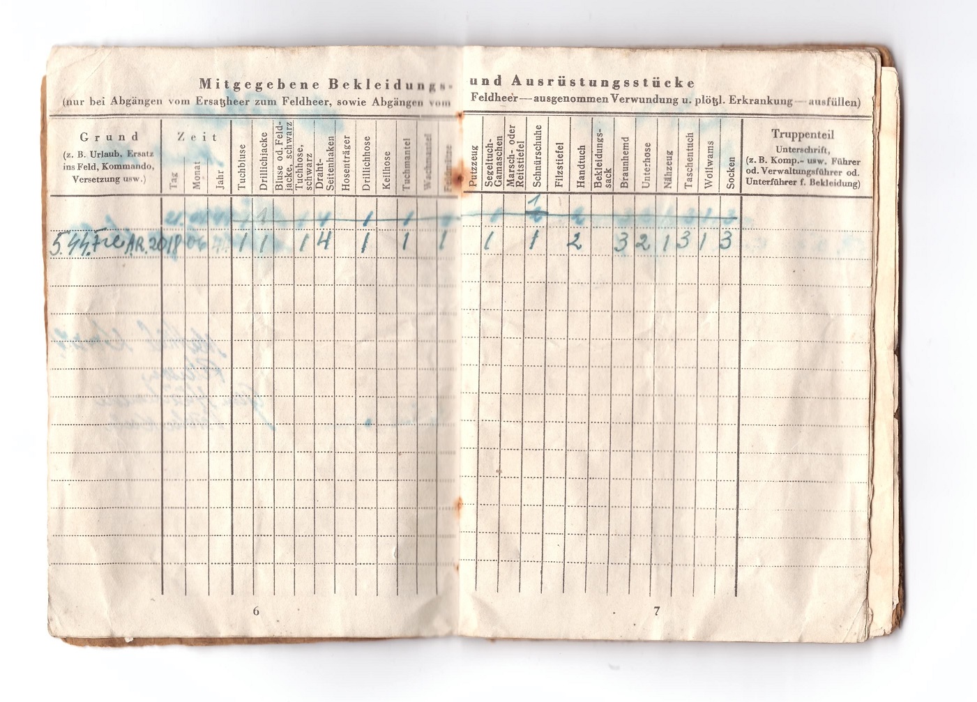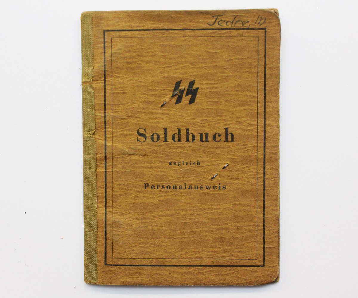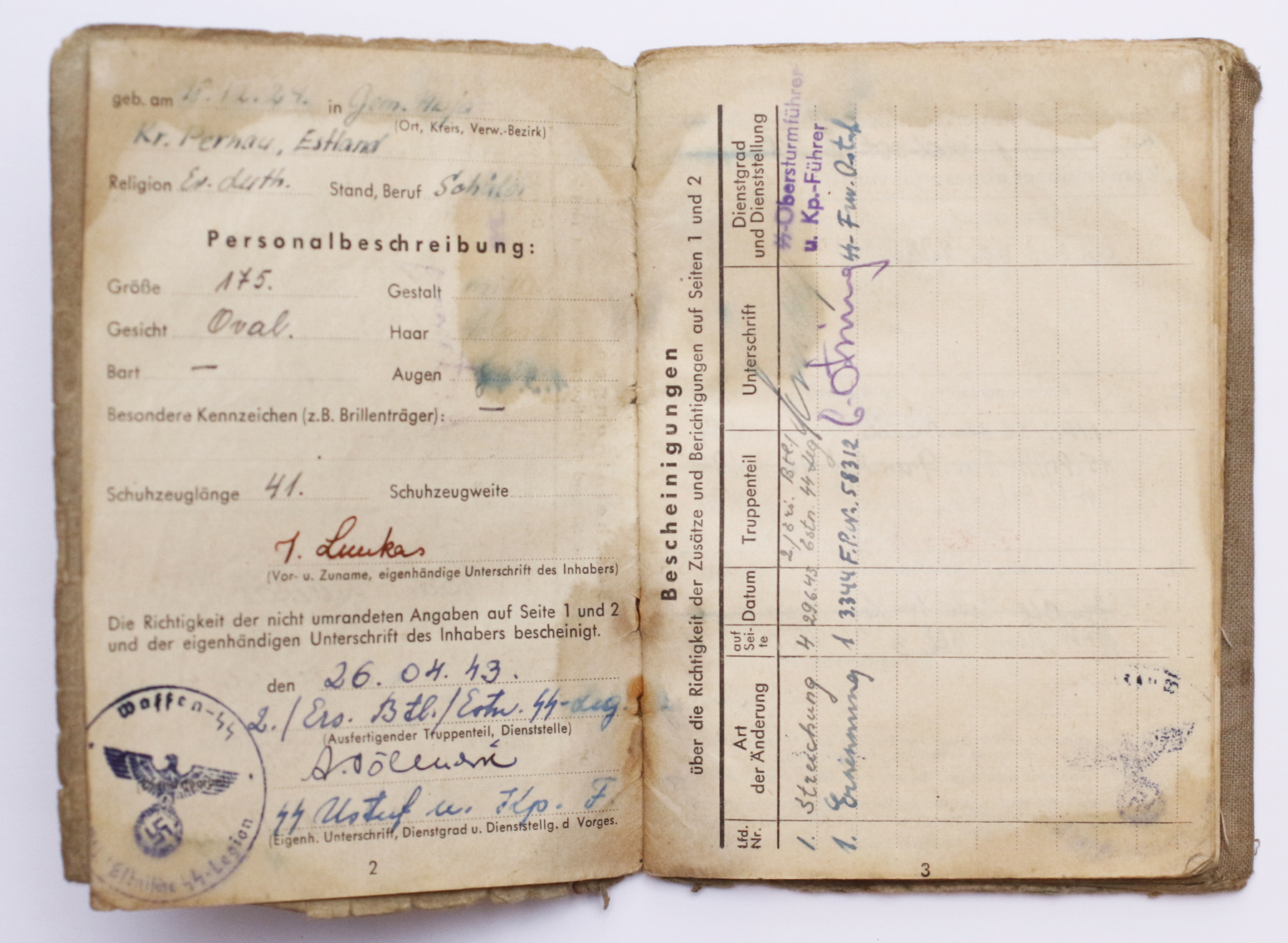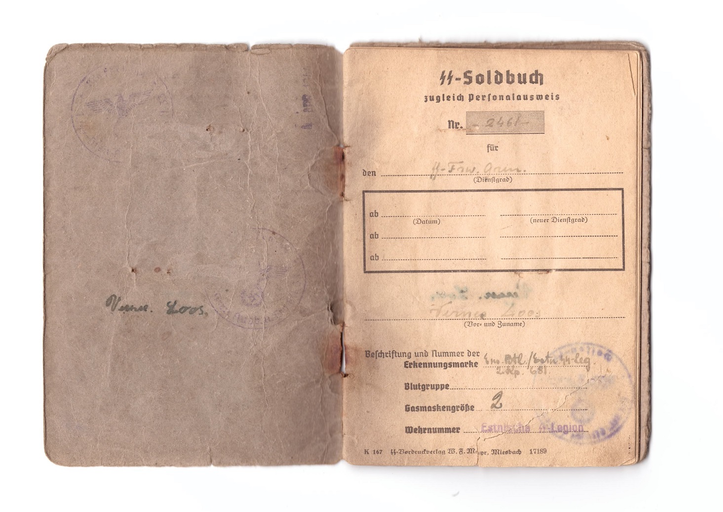 SS-Frw.Grenadier Verner Loos´ile kuulunud Soldbuch. Vähestest märgetest huvitavaim on sissekanne granaadi(mürsu) killust haavata saamise kohta.