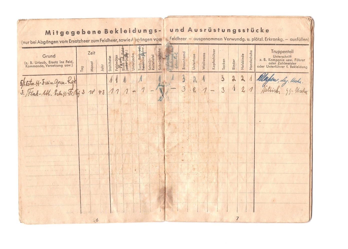 SS-Frw.O.Grenadier Leo Peterson´i Soldbuch. Klooga Soldbuchile omaselt on sissekandeid hõredalt. Küll aga leiab varustuslehelt huvitava märke, et talle on kätte jagatud Tarnjacke.