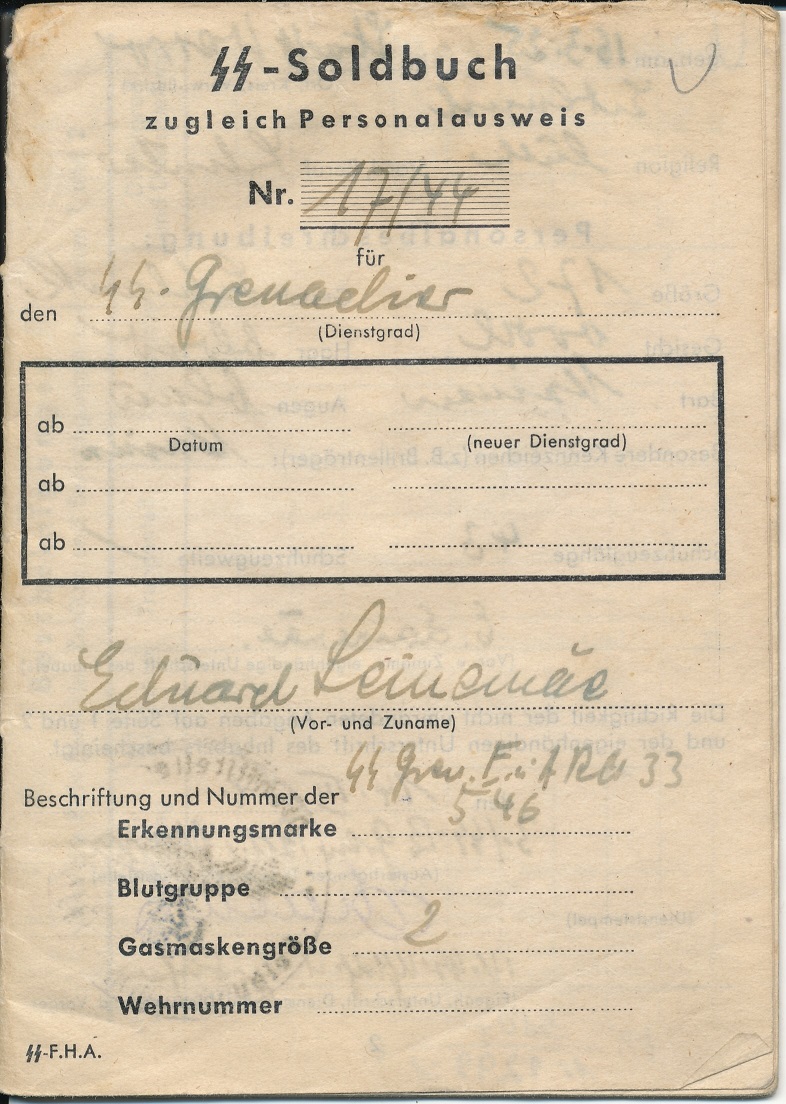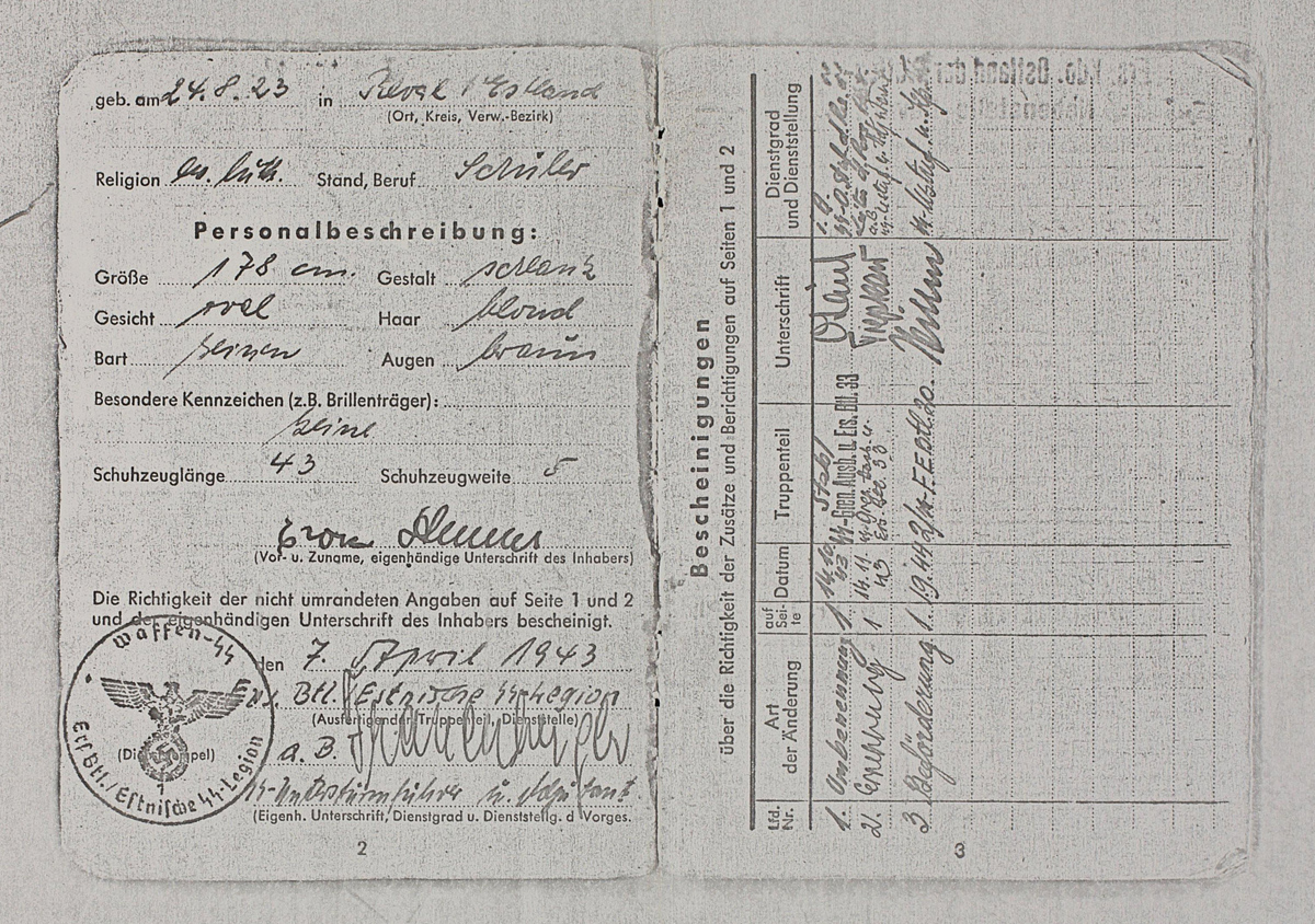 UnterKroon kirjutas:Eelpool kõne all olnud pataljon "Narwa" 3.kompaniisse kuulunud SS Grenadier Eduard Lainemäe Soldbuch ning muud dokumendid ja esemed.