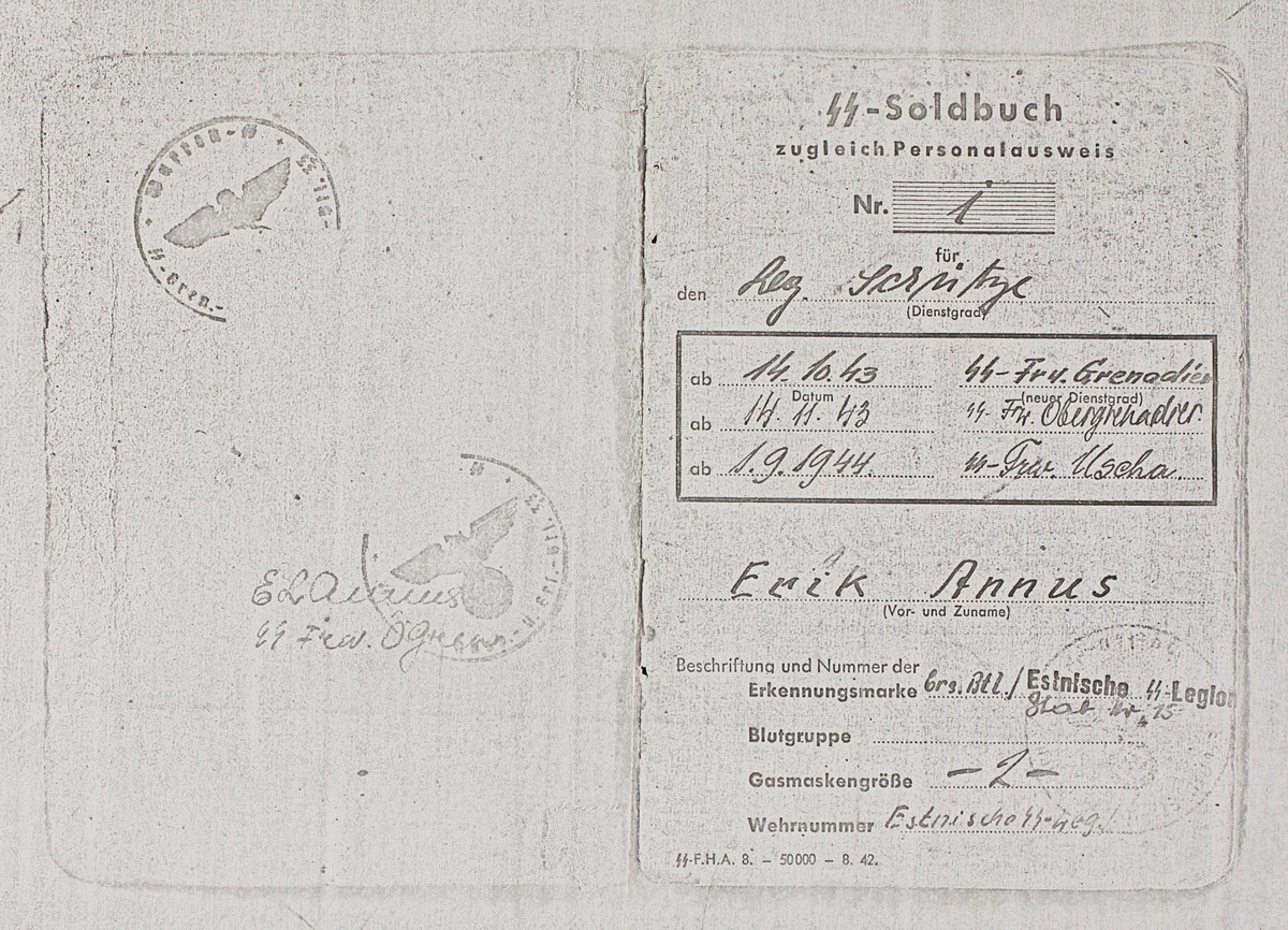 Rahvusarhiivis on Eesti Sõjaveteranide Sõprusühingu materjalide hulgas kaks pilti SS Freiwillige Unterscharführer Erik Annus'e palgaraamatust.