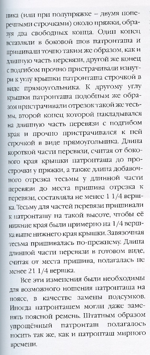Tsaariväes kasutuselolevad nahaga kanditud taskud (1900. aasta mudel) mahutasid 6 padrunipidet, uus presendist tasku aga 2 korda rohkem. Samuti loobuti naha ja valgevase kasutamisest. Padrunitaskud valmistati immutatud purjeriidest (presendist), pandlad rauast.