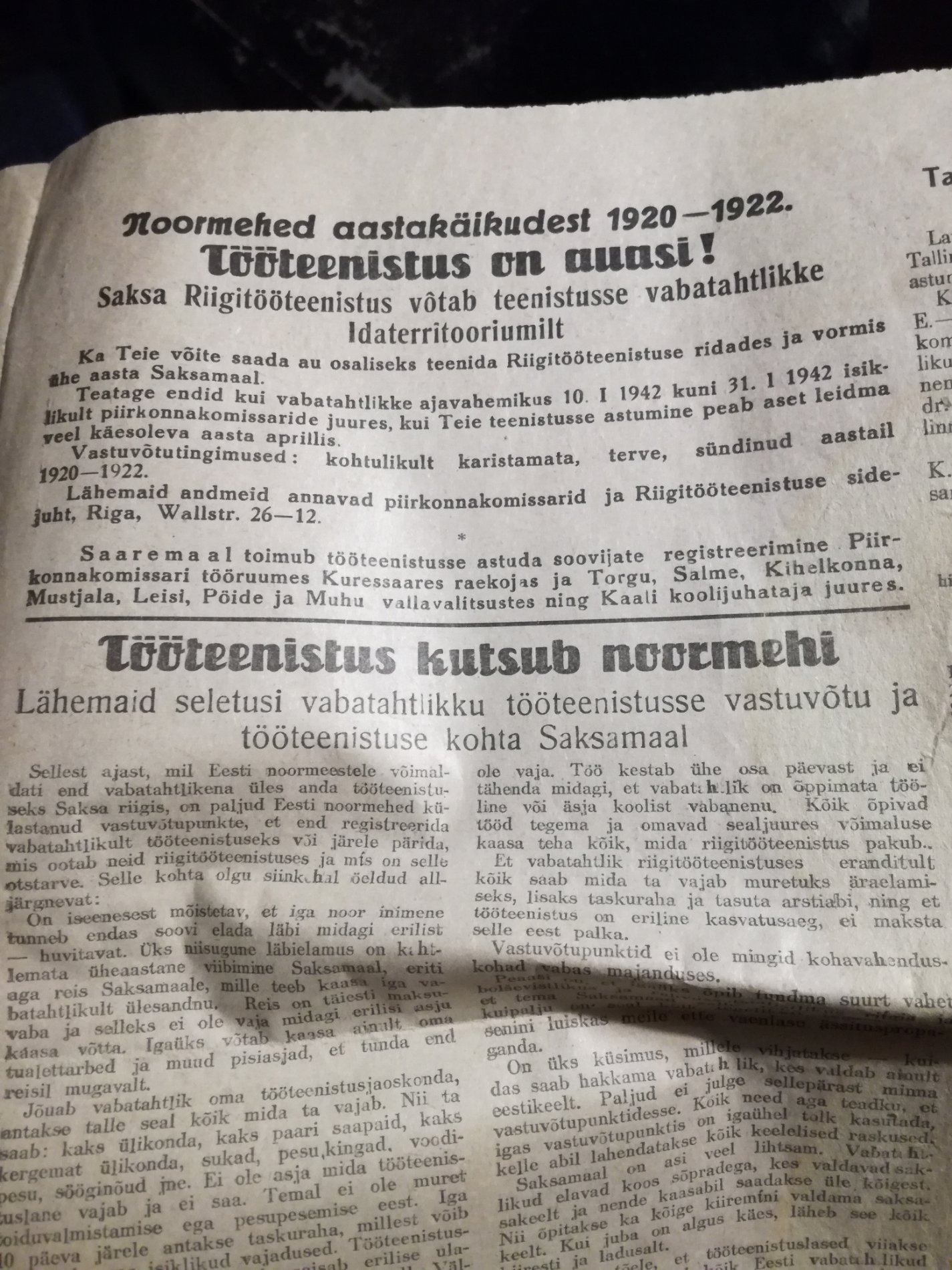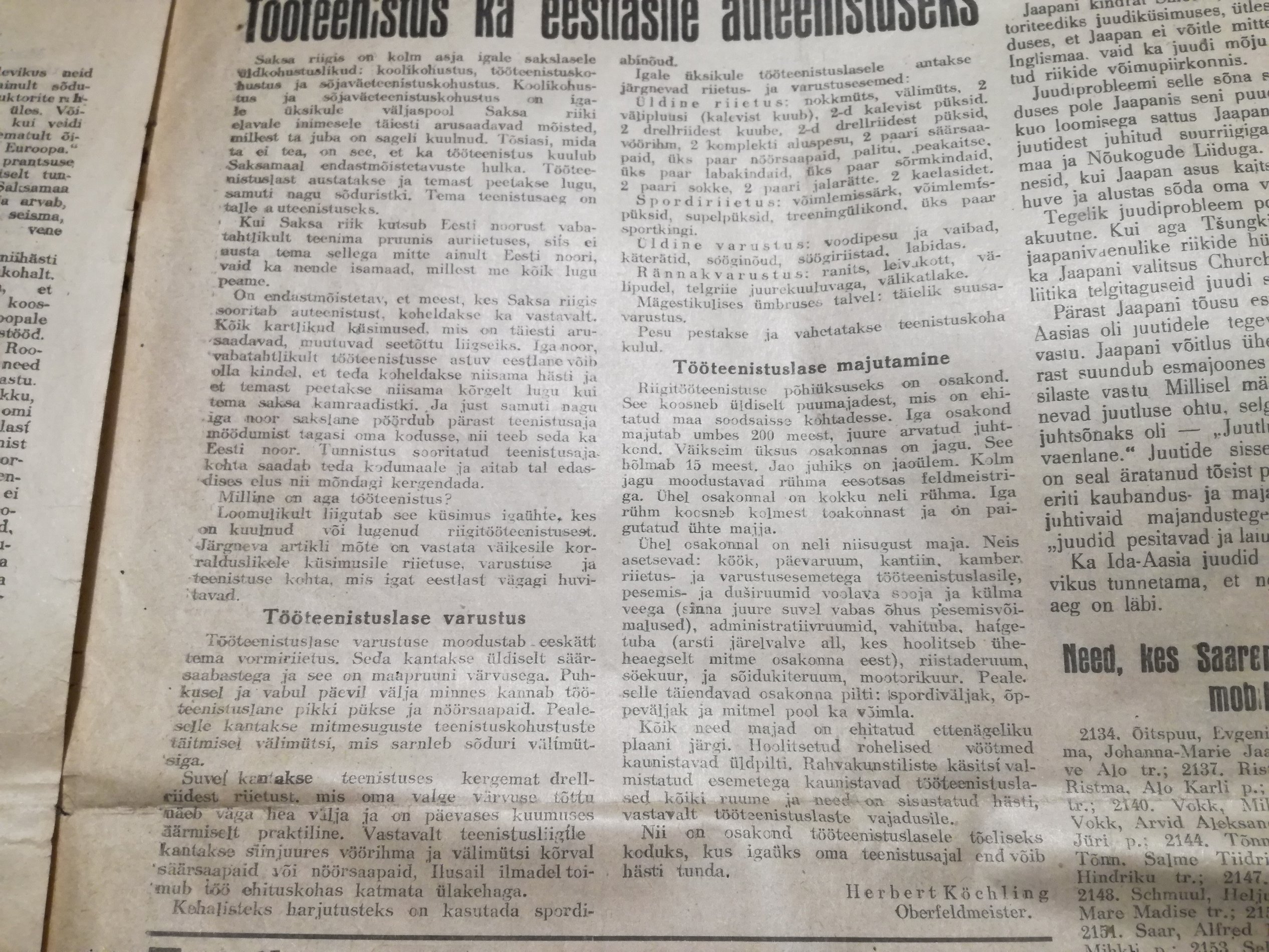 Jah, armeeteenistuse reklaamimise kõrval käis ka usin Tööteenistusse kutsumise propaganda ja poisid läksid ka. Minu onu Leopold läks ilmselt sama kampaania käigus mida antud ajaleheartikkel kajastas. Ajendiks sai regulaarne valla poolt esitatud küttepuude varumise/valmistamise nõue millest sai peagi kõrini. Märtsis läks Rakverest Virumaa meestega rongiešelon ca 180 mehega teele, Tapal ühines umbes sama palju vaguneid Tallinna, Lääne-Eesti ja Saaremaa meestega (Lõuna- ja Kesk-Eesti omi ei olevat olnud), sõideti Poola Ratzki väljaõppe laagrisse. Sealt mai alguses 1942 saadeti edasi Põhj-Saksamaale Wesermünde linna lennuvälja laiendustöödele.