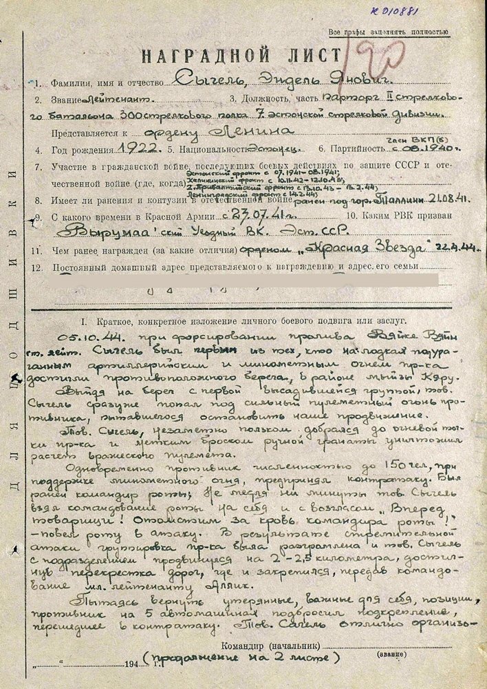 Sõgelile Lenini ordeni andmisega olid autasulehe järgi kõik nõus. Alates polgukomandörist, kuni 8. armee juhataja, kindralleitnant Starikovi ja armee sõjanõukogu liikme kindralmajor Zubovini välja. Kuid Lenini ordenit ta ikkagi ei saanud. Ei teagi, kes sellele kriipsu peale tõmbas.