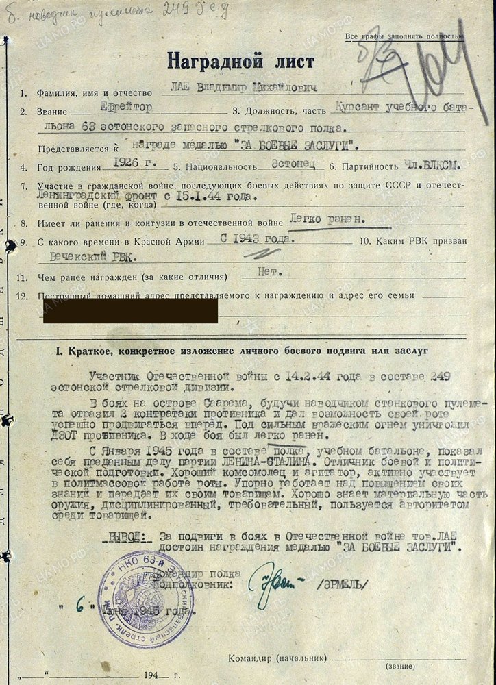63. Reservlaskurpolgu õppepataljoni kursant, hiljem 105. Üksiku kaardiväe laskurpataljoni miinipildujate roodu miinipildur kv jefreitor Vladimir Lae. Juba 17. aastaselt punaarmees. Teda autasustati 1949. aastal Vapruse medaliga ja seda septembris 1944. a Saaremaa lahingutes osalemise ning haavatasaamise eest. Medali sai ta kätte 1952. aastal. Samasse dokumenti on sisse kantud ilmselt samuti viiekümnendatel aastatel talle antud Lahinguteenete medal. See võib olla talle 1945. aastal määratud medal, mille sai lihtsalt kätte hiljem. 1990. aastal sai ta aga veel ühe Lahinguteenete medali, mis käskkirja numbri järgi on just see, mis talle 1945. määrati. Natuke segane, aga huvitav lugu.