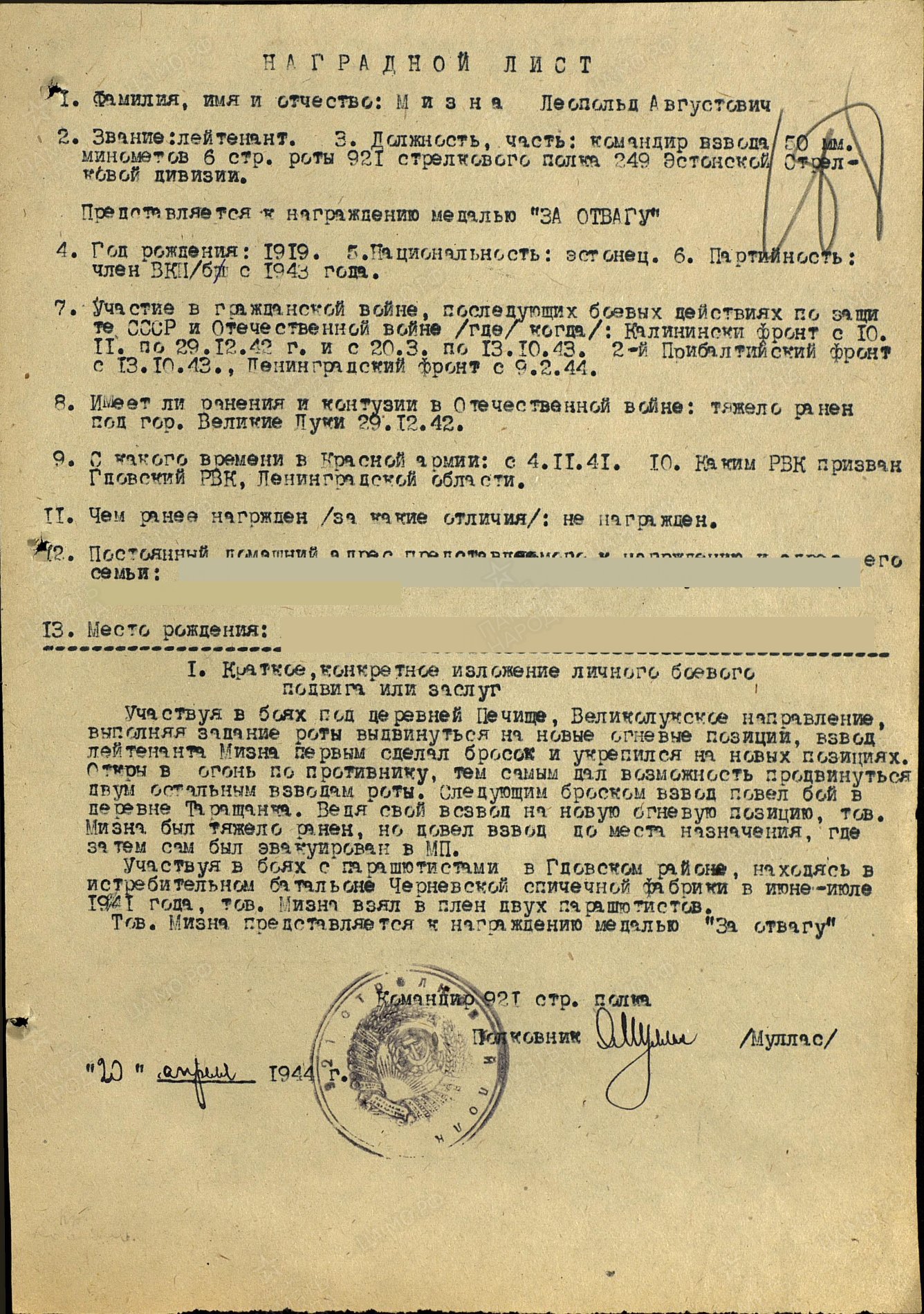 Leitnant Leopold Miisna ( autasulehtedel Мийзна ). 249.LD, 921. LP, 6. roodu 50mm miinipildujate rühmakomandör.
