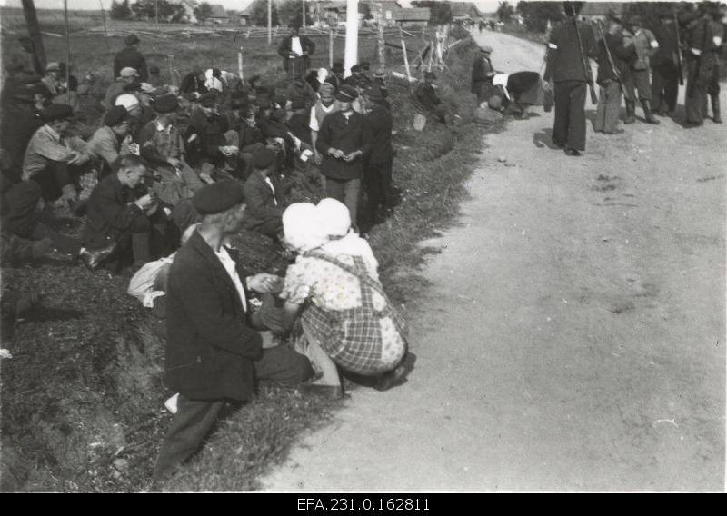 Siia kõrvale samuti 41. aasta pilti sarnase olustikuga, pealkirjastatud FB-s "Väike-Kolkja mehed ööbimiskohal enne deporteerimist. Teel valvavad omakaitseväelased."