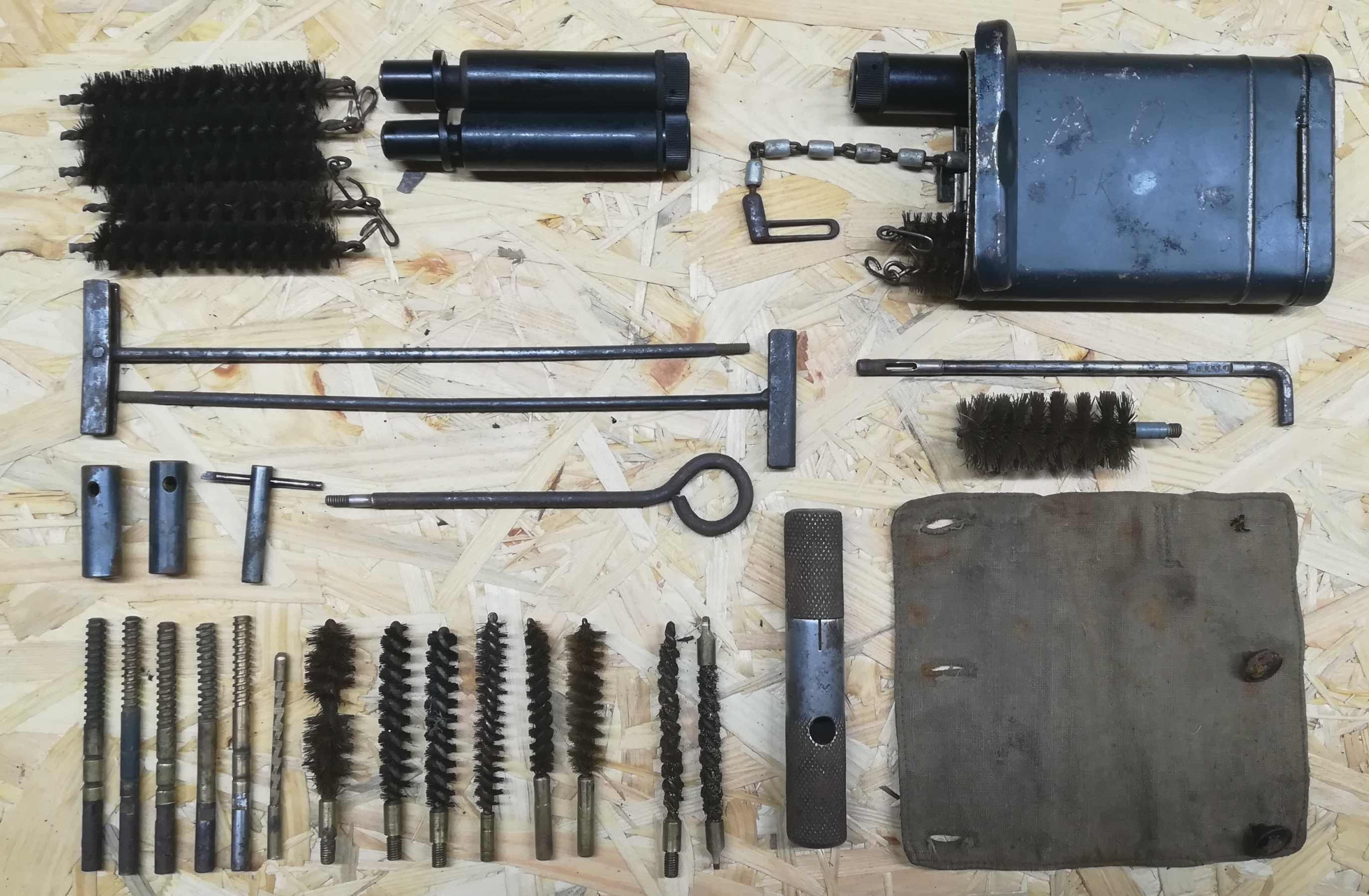 Ostsin hiljaaegu puhastuspinalite sisu assortiikarbi. K98 komplekti panin kokku ja ülemine rida on sama kraam. Need pööratava otsaga vardad peaks ppsh omad olema, see jämedam hari karbi all vast mingi hilisem jahirelv ja too L kujuline varras peaks olema FN Browning oma (aga ilmselt mitte HP, vaid mingite vanemate mudelite jagu). Riidest kott- saan aru, et SVT oma, aga ilmselt justkui vähem levinud, sest tegu on tehasest tulnud kolme nööbiga isendiga, hiljem enam nii palju nööpe ei jagunud. "Toru" pinal on mosina oma, need vasakul keskel olevad virblid ja võti peaks SVT jagu olema, aga kõvera otsaga varras ja harjahunnik vajaks veel suunamist. Kõige parempoolsemal kahel harjal on peale pressitud "K" ja üldiselt ei tundu need vene nägu olevat.
