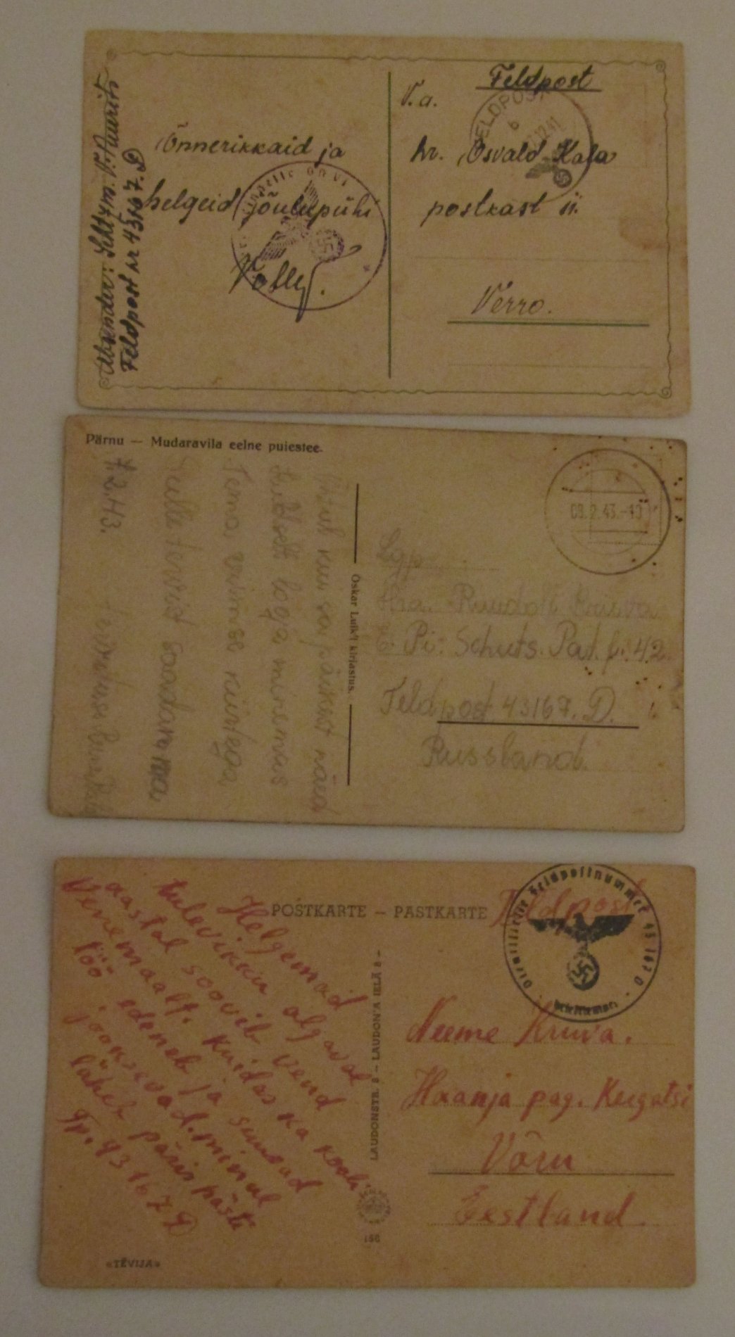 Kolm 42.Eesti Politsei-Pioneeri pataljoni Feldposti.Lisaks üks Feldpost mille saatjaks on keegi Priit Põld kes on just saadetud 4.Piirikaitserügemendi täienduseks.Nagu kirjast lugeda võib siis Sakslasi ta eriti ei armastanud :D