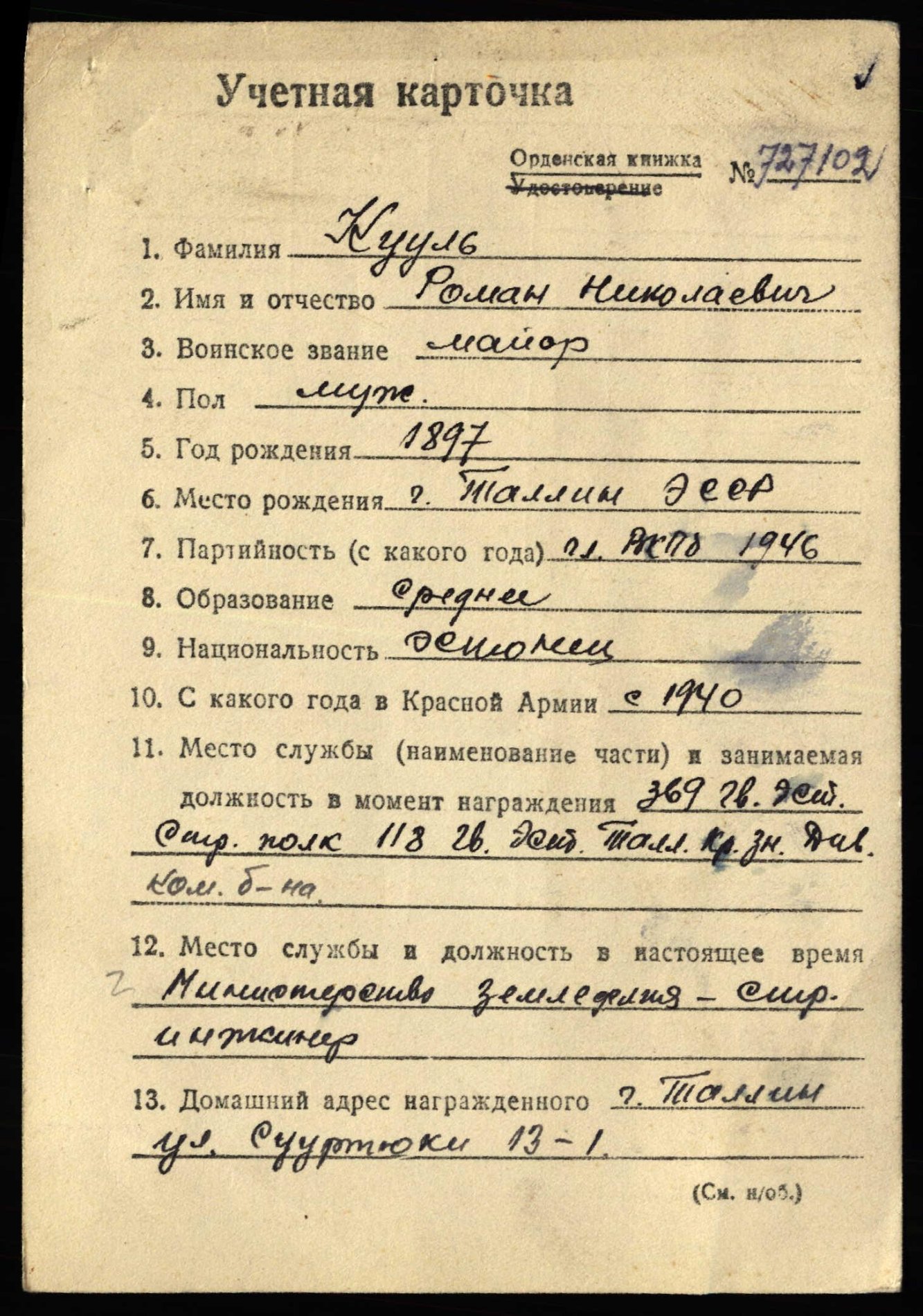 Punatähe orden 939392 on siin teemas juba ammu, aga nüüd on ka taust teada. Ordeni kavaler on major Kuul ( VR II/3 kavaler ), 7. Eesti laskurdiviisi 27. laskurpolgu komandöri abi varustuse alal. Major Kuul on autasustatud veel Isamaasõja II klassi ordeniga nr. 428601, Kuramaa lahingute eest.