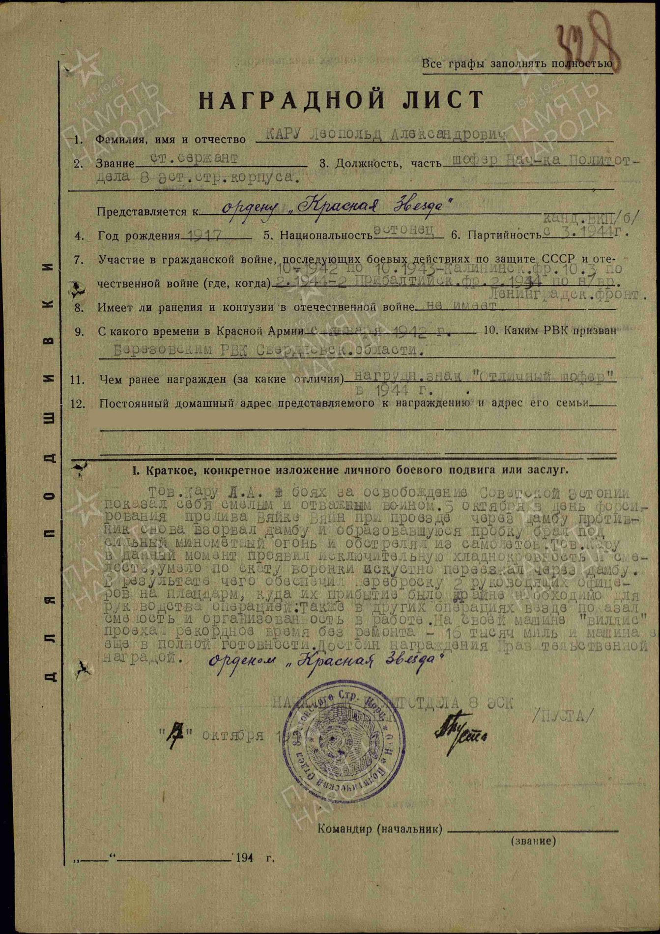 Ka Punatähe orden nr. 939477 on siin teemas olnud varem, kuid nüüd on autasustatu teada. Selleks on vanemseersant Arnold Karu, 8. Eesti Laskurkorpuse poliitosakonna autojuht.