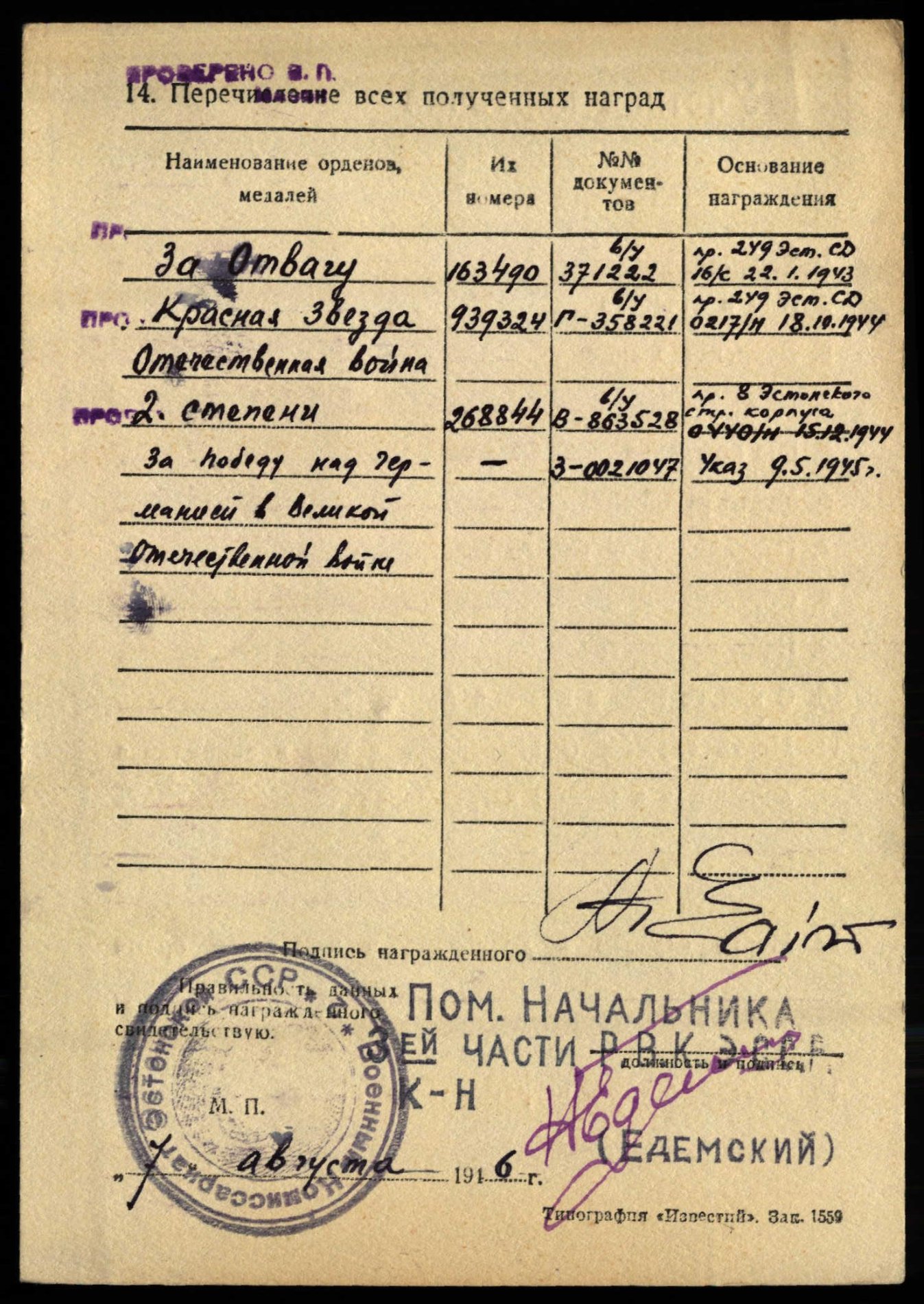 Kiire tõlge Punatähe ordeni autasulehelt ( ilmselt on sellel osade vaenupoole üksuste numbritega eksitud, võib täpsustada ):