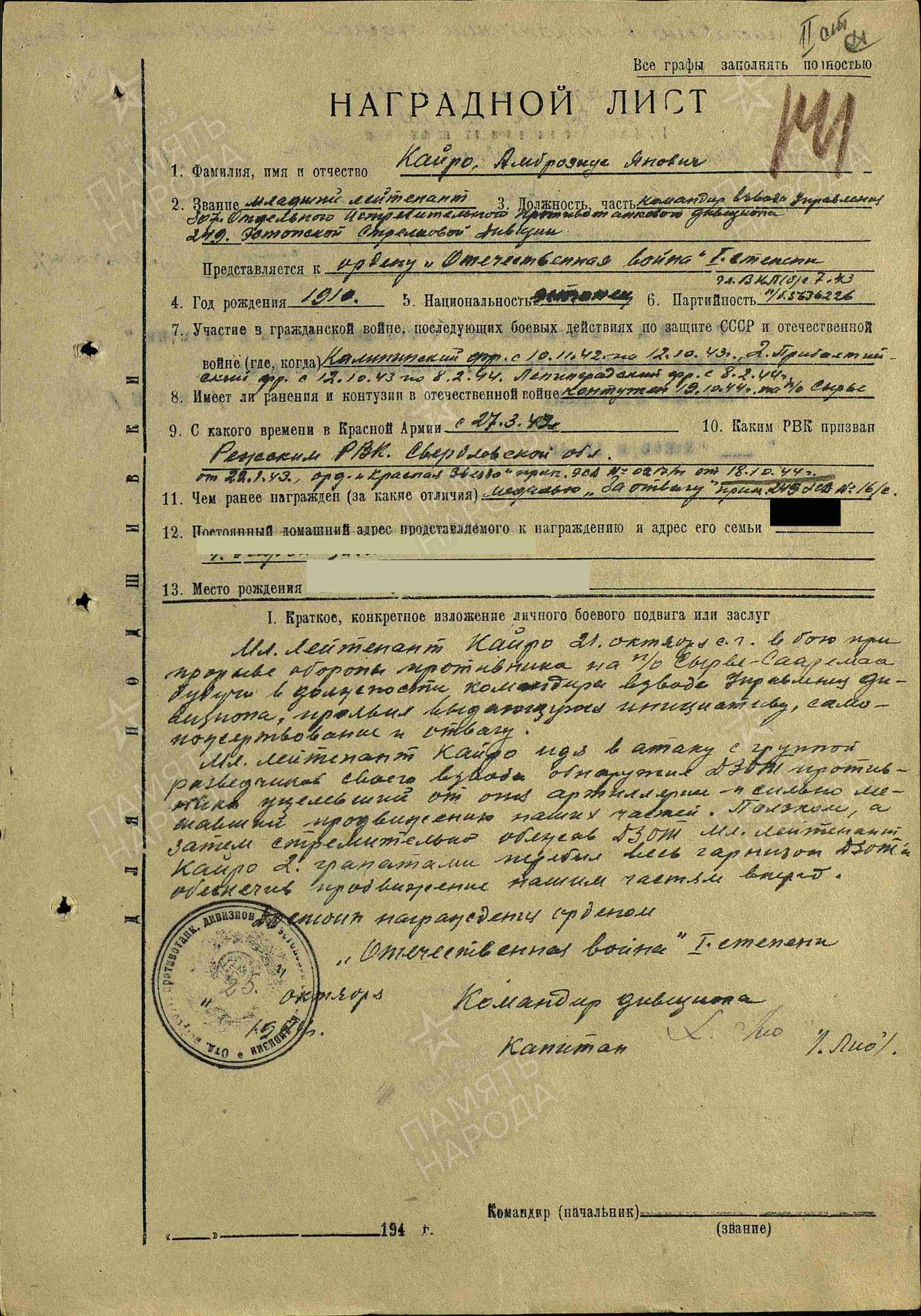 249. laskurdiviisi 307. üksiku tankitõrjedivisjoni rühmakomandör nooremleitnant Ambrosius Kairo, Isamaasõja II klassi ordeni nr. 268844 kavaler.