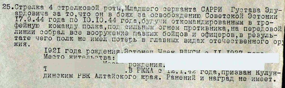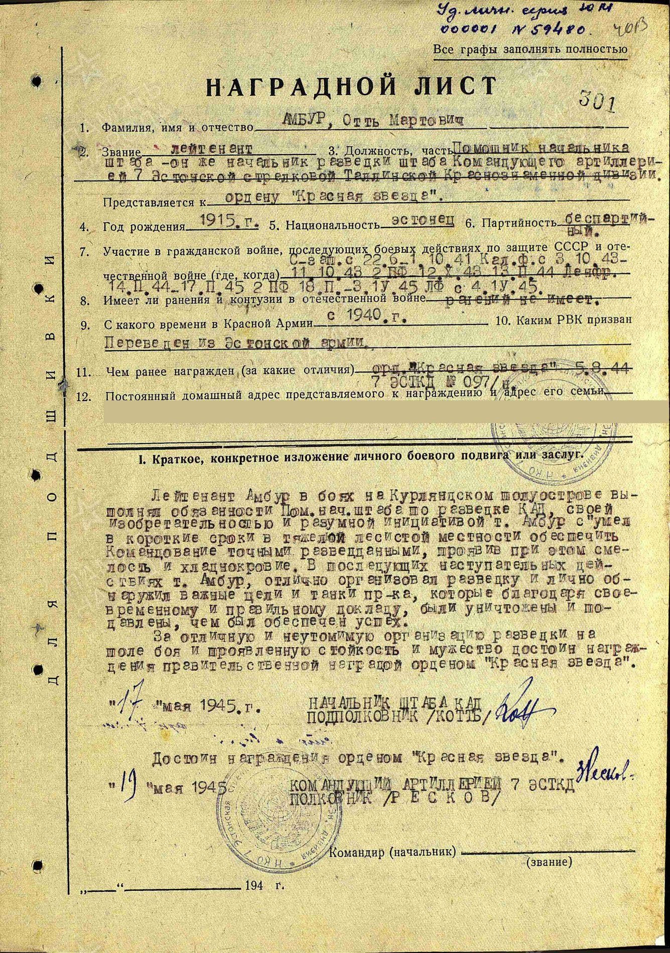 7. laskurdiviisi staabiülema abi- diviisi suurtükiväeülema staabi luureülem leitnant Ott Ambur, Punatähe ordeni nr. 843642 ja Isamaasõja II klassi ordeni nr. 428777 kavaler.