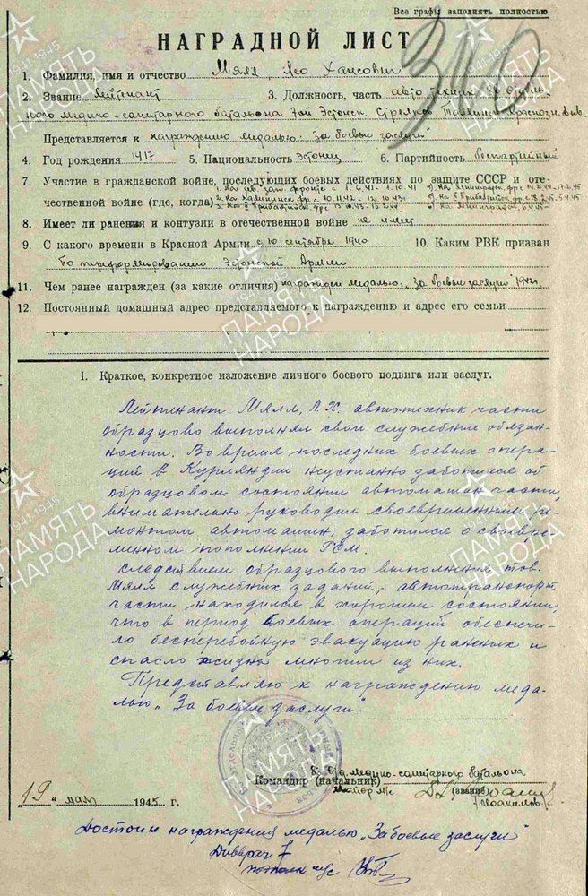 7. Eesti laskurdiviis, 86. Üksiku sanitaarpataljoni autotehnik leitnant Leo Mäll. Lahinguteenete medalite nr. 120488 ja 2499378 kavaler.